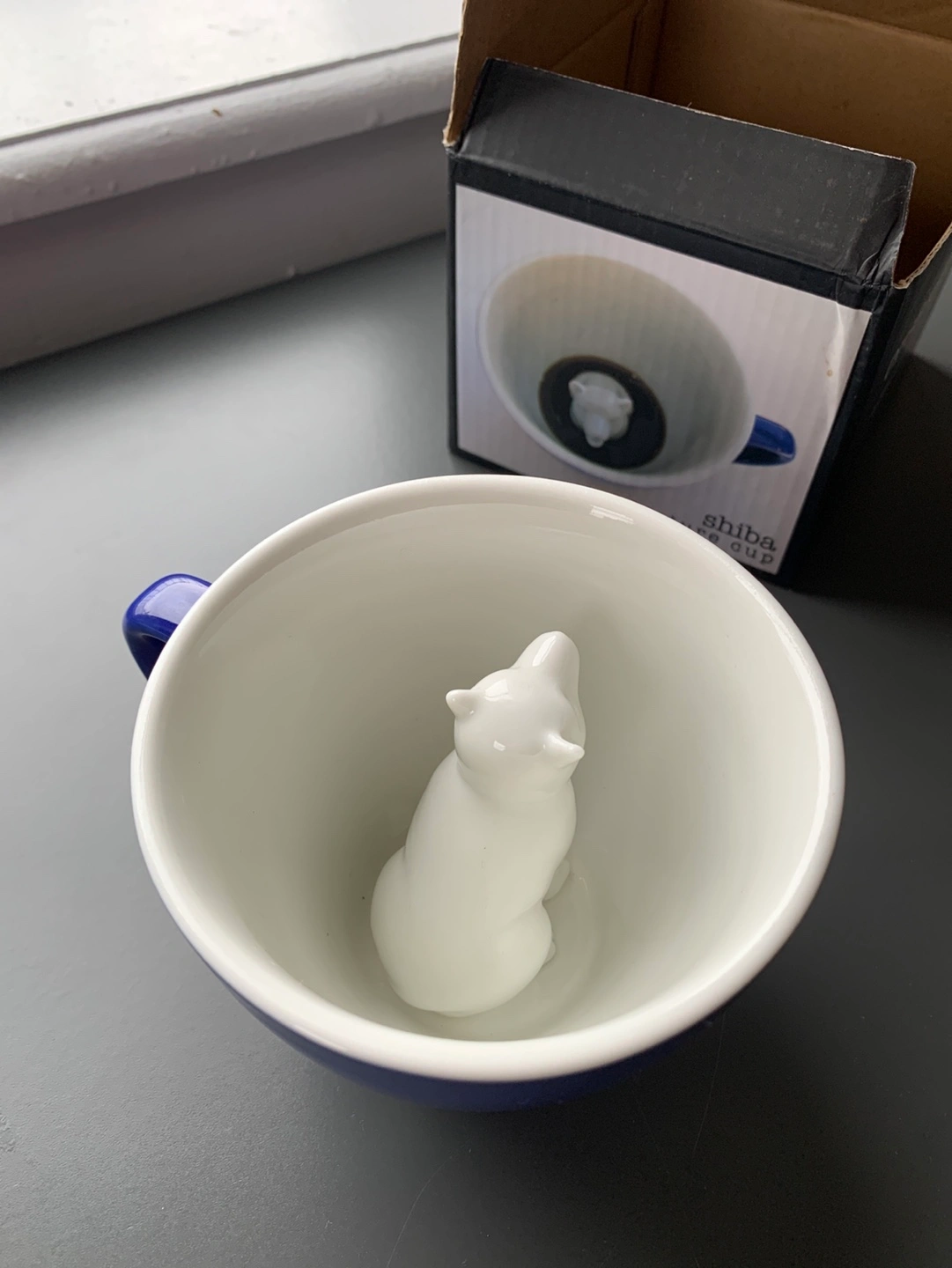 New Creature Cups mug. 11 oz. Dishwasher safe. Blue exterior, white interior. Features a small hidden creature inside - white bear. Comes in original box. Could be a great unique present! Retail price $16.99 + shipping and taxes