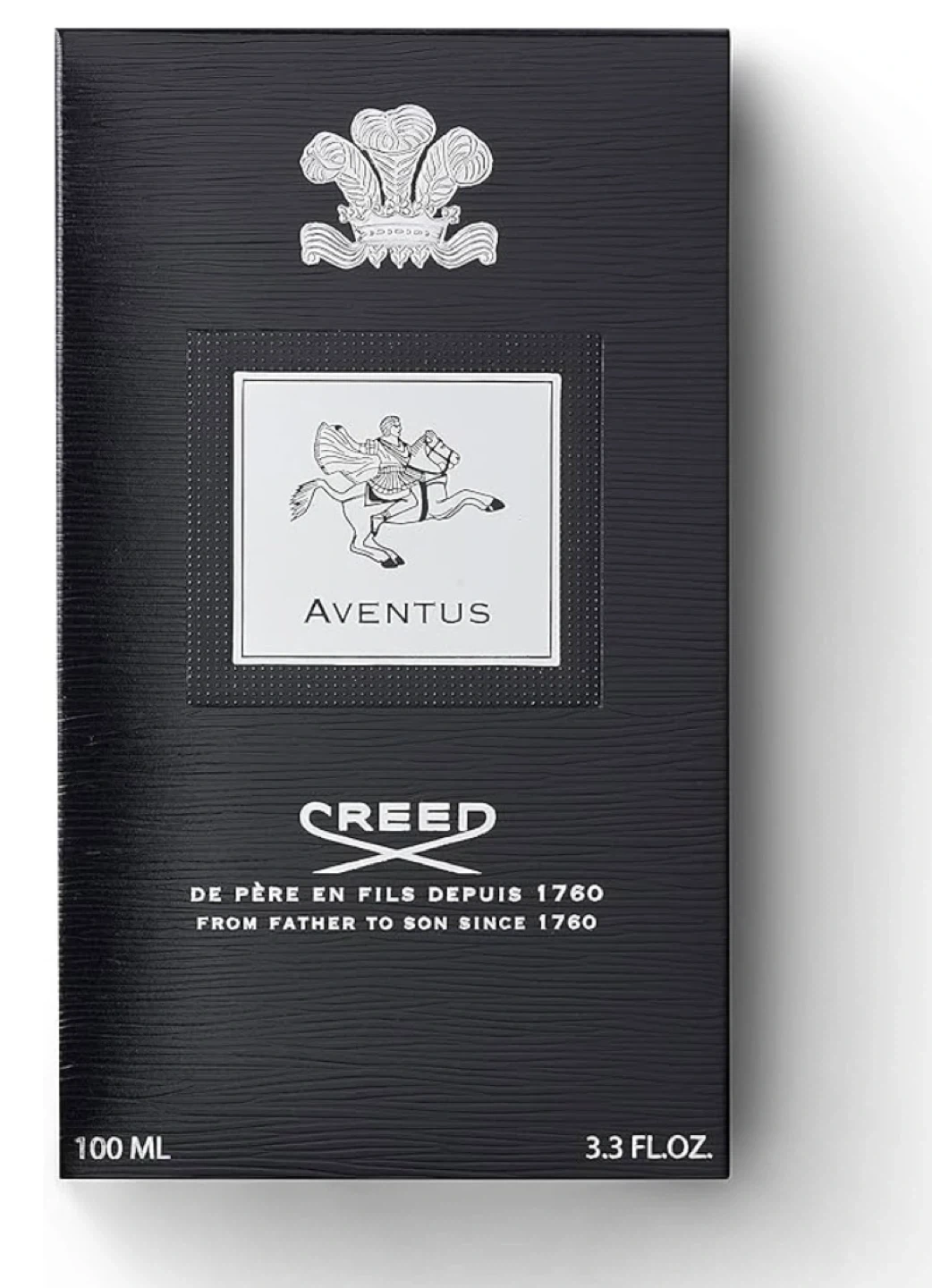 65Selling a bottle of Creed Aventus. It's a 3.3 fl.oz (100ml) bottle in its original box. The box states 'De Pere en Fils Depuis 1760 - From Father to Son Since 1760'.