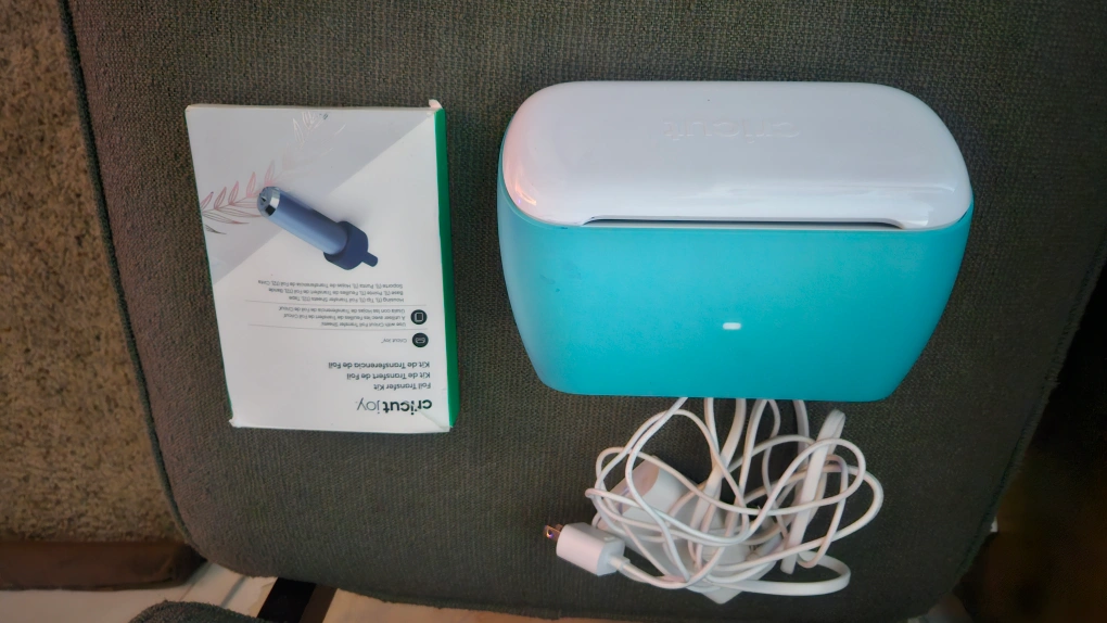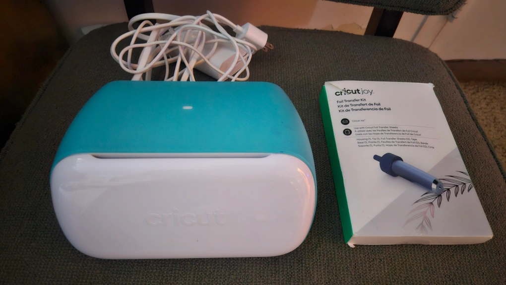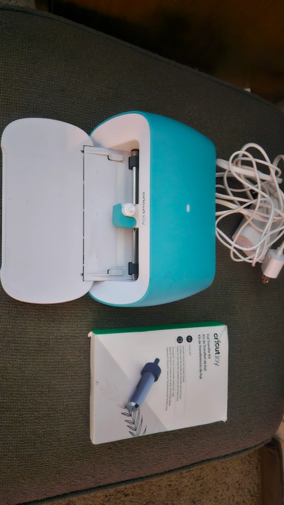 82Cricut Joy Foil Transfer Kit includes machine and foil tool. Teal and white machine. Includes power cord and an assortment of 5x7 vinyl sheets in an assortment of colors. Used condition.