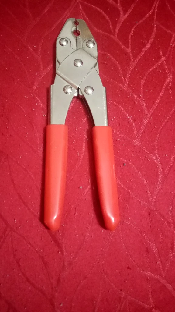 141Pliers with red handles. Used for crimping.