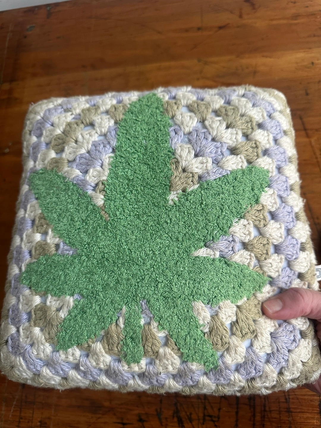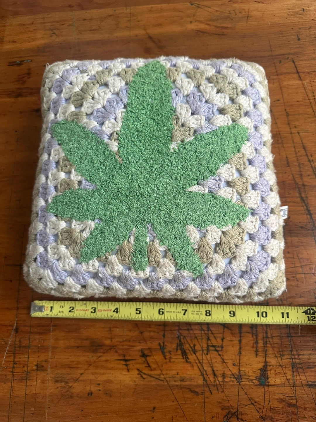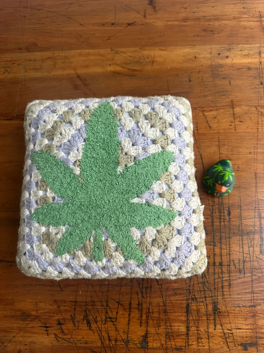 Adorable crochet pillow featuring a green marijuana leaf design and rubber duckie selling both together.