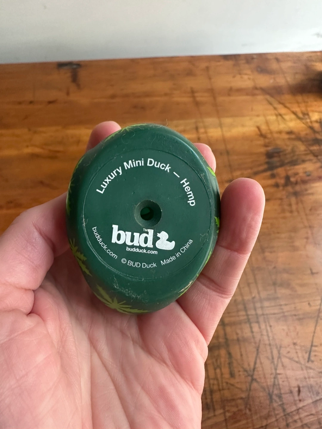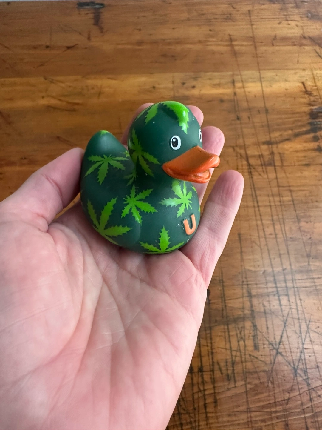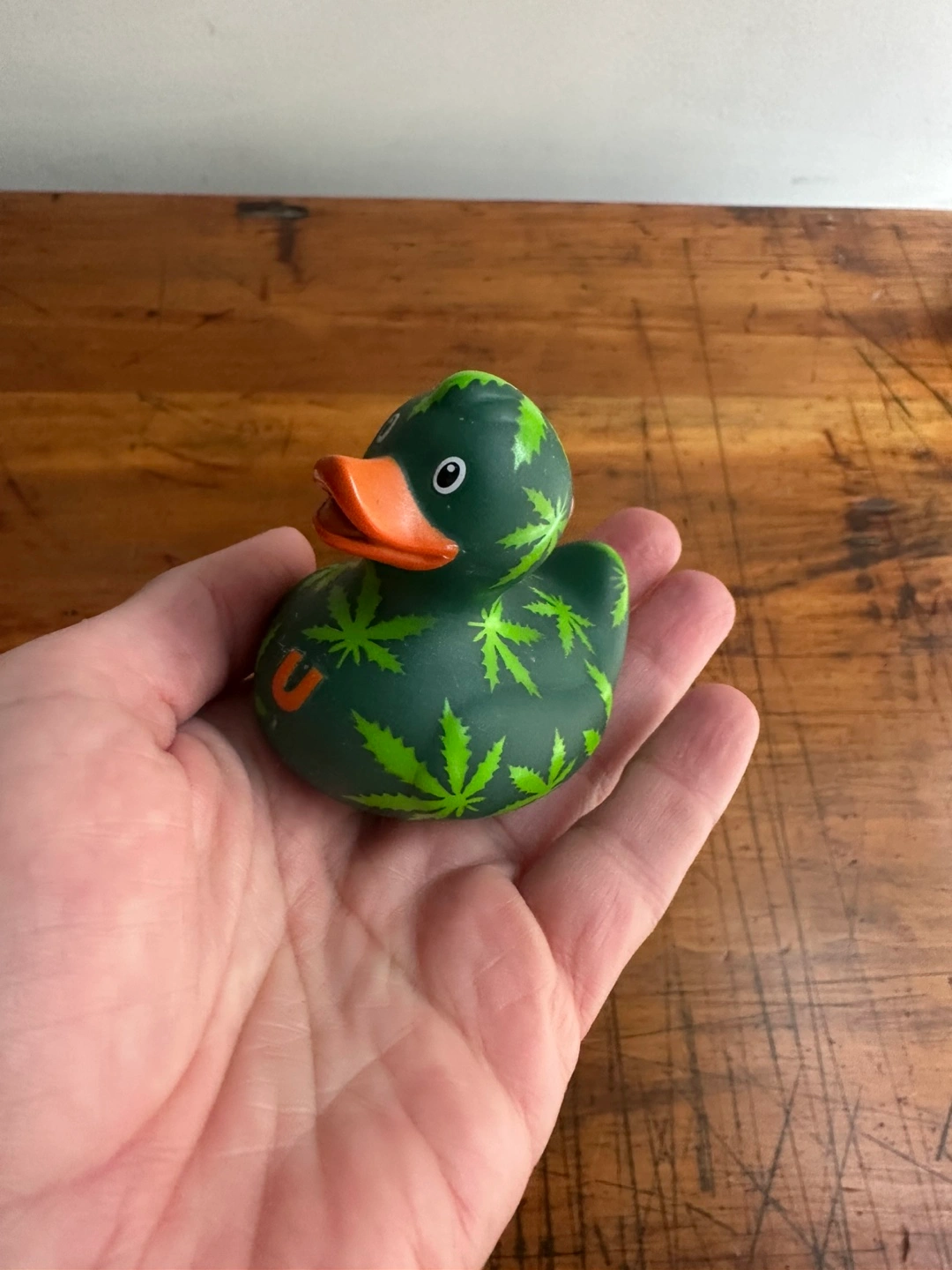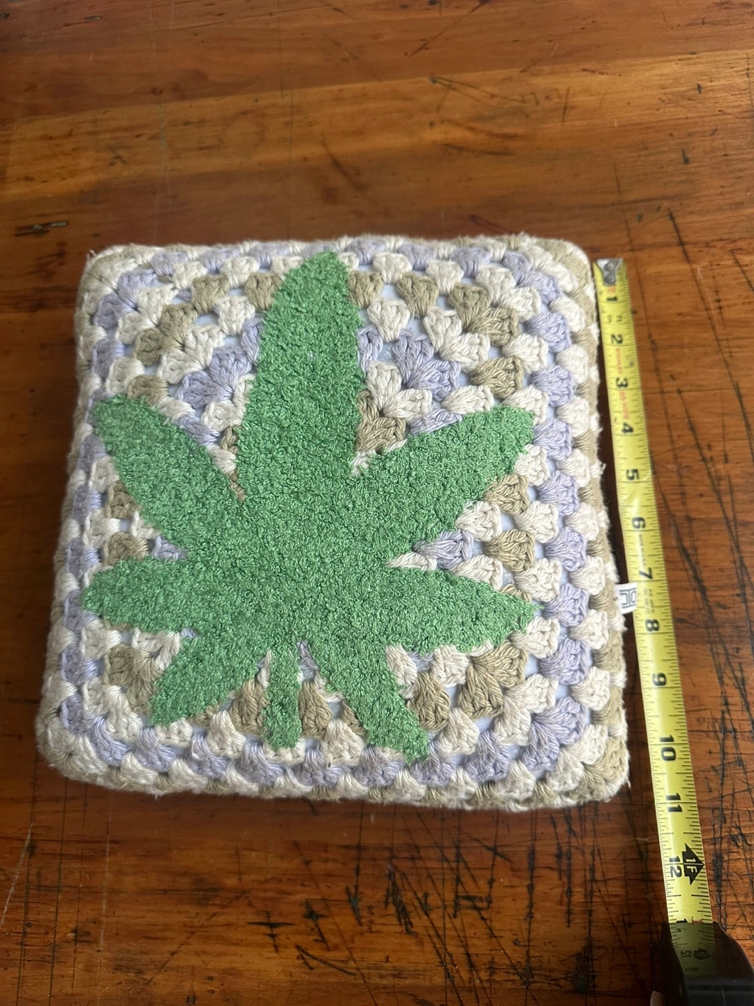 Adorable crochet pillow featuring a green marijuana leaf design and rubber duckie selling both together.