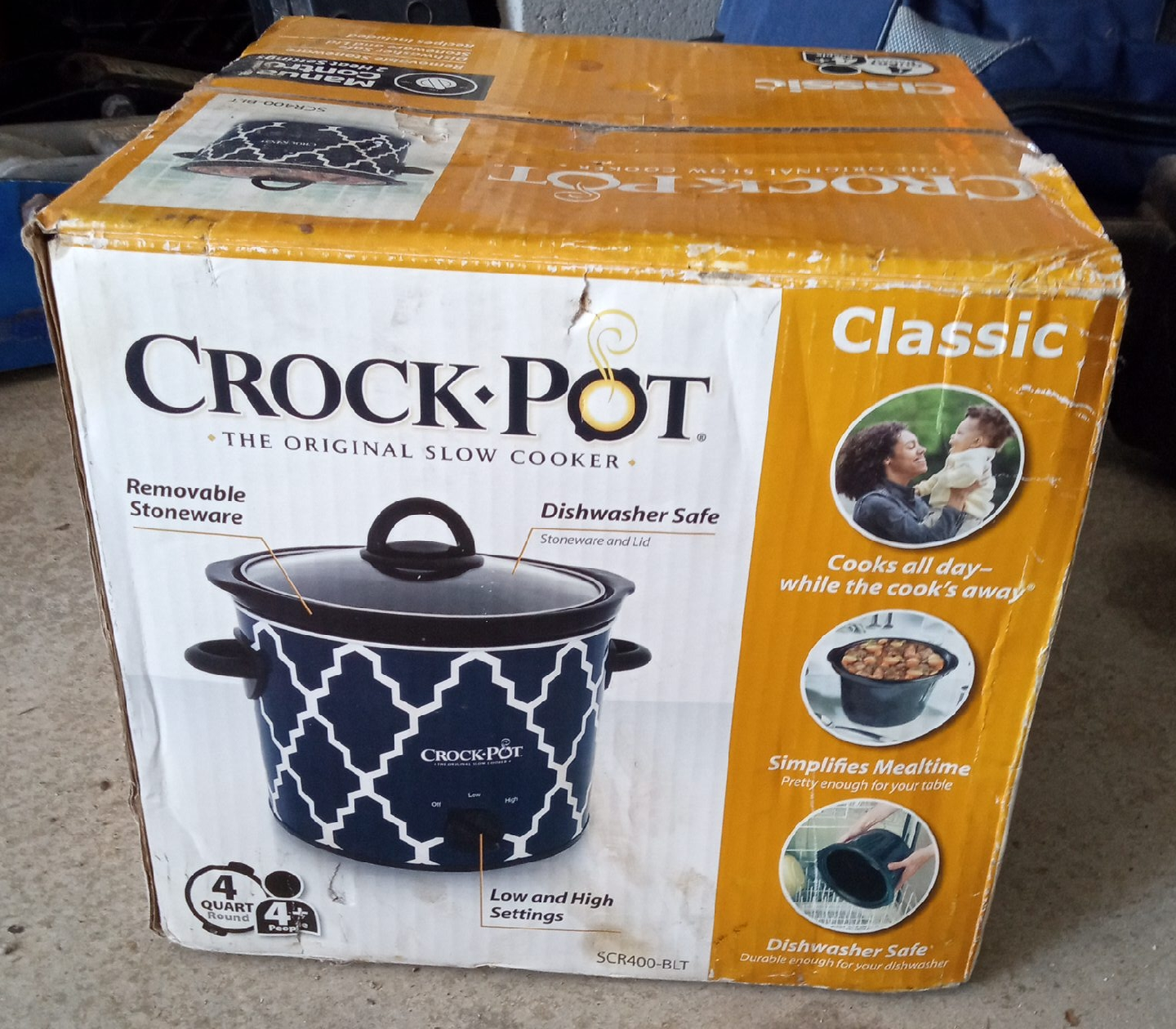 I'm selling a Crock-Pot Classic slow cooker. It's a 4-quart size, perfect for cooking meals for the whole family! It features removable stoneware and a dishwasher-safe lid. You can select between low and high settings