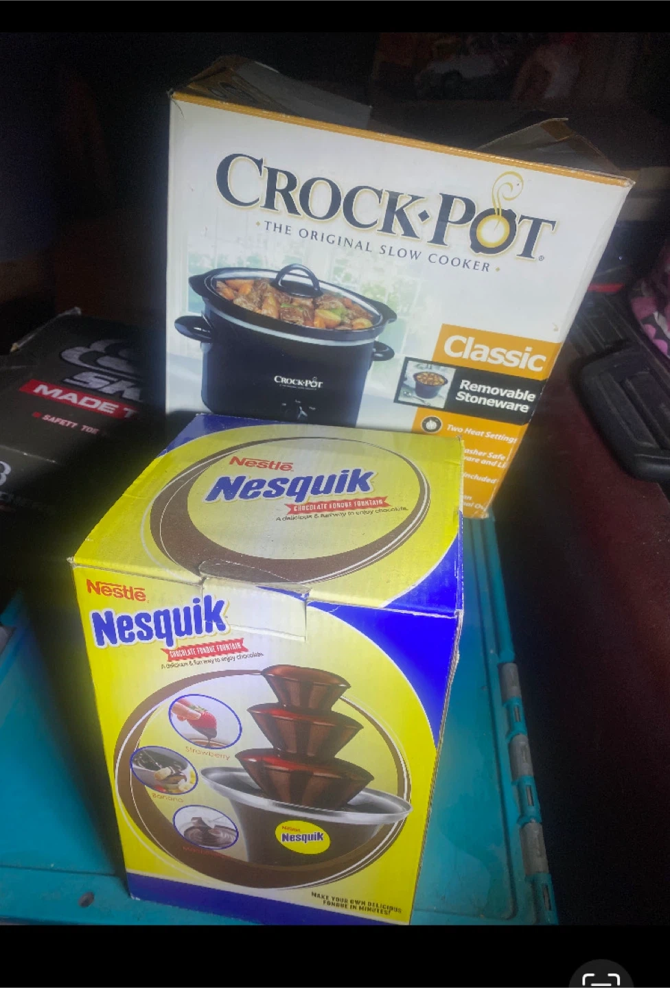 Selling a Crock-Pot slow cooker and a Nestle Nesquik chocolate fondue fountain. Both come in their original boxes and appear to be in good condition!