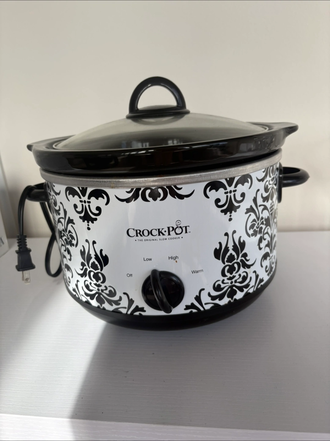 10Selling a Crock-Pot slow cooker in great condition! It features a black and white floral design. It has settings for Off, Low, High, and Warm. Perfect for making delicious meals!