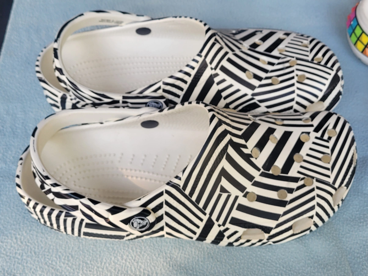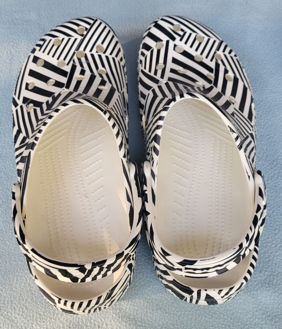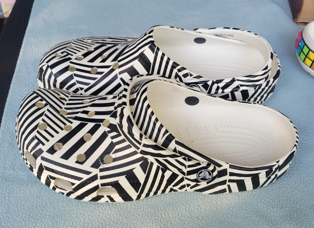 These are a pair of Crocs Classic Clogs in a striking black and white pattern! They're a Men's size 11 and ready for a new home. Perfect for adding a bit of fun to your everyday wear!