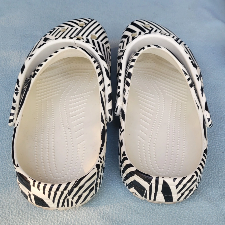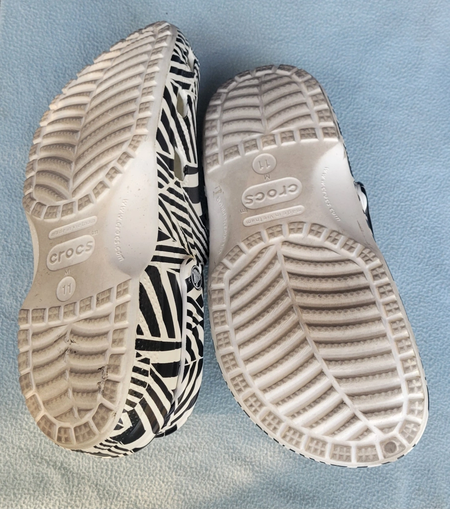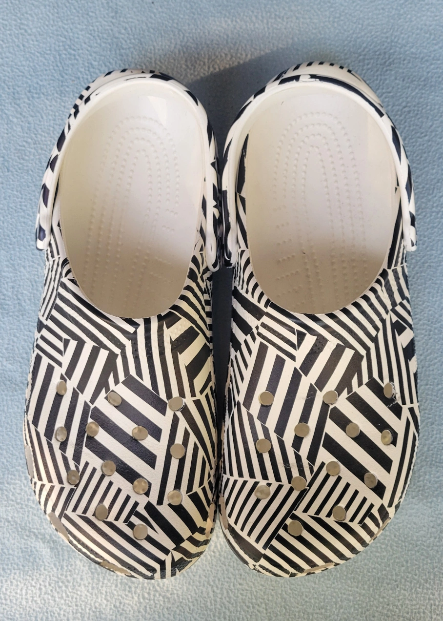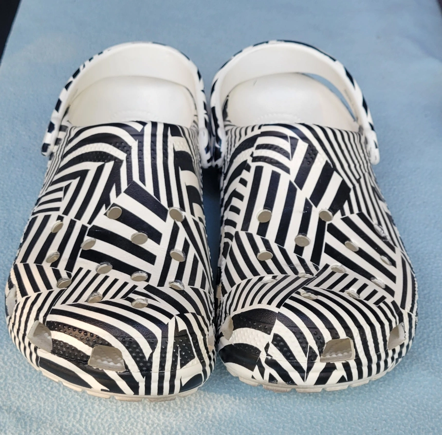 These are a pair of Crocs Classic Clogs in a striking black and white pattern! They're a Men's size 11 and ready for a new home. Perfect for adding a bit of fun to your everyday wear!