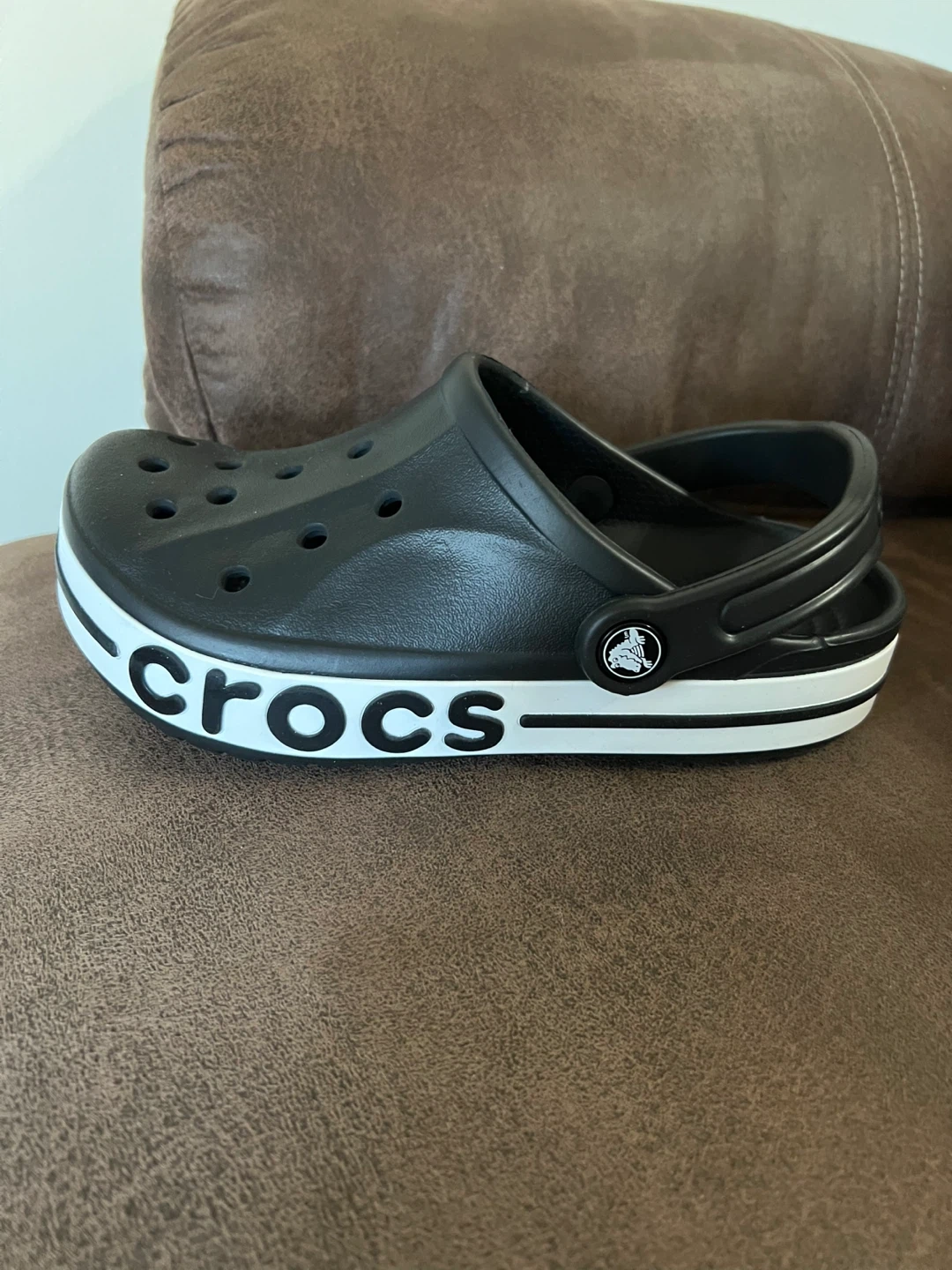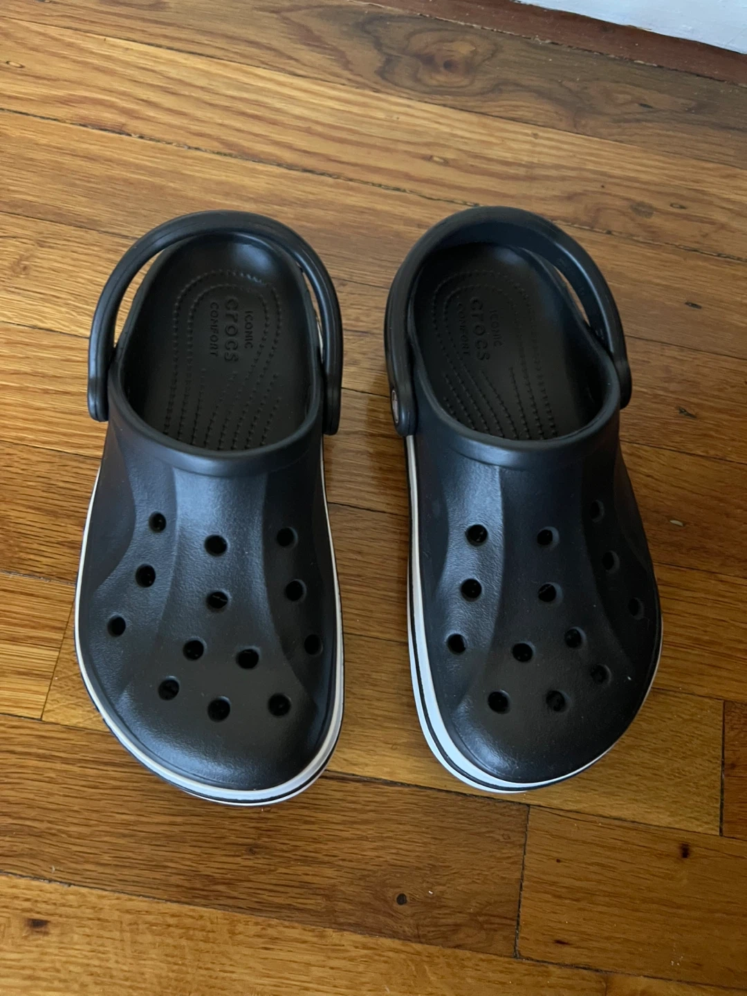 Selling a pair of Crocs Classic Clogs in black with a white stripe! They are in great condition and are a size M4/W6. Perfect for casual wear or just lounging around