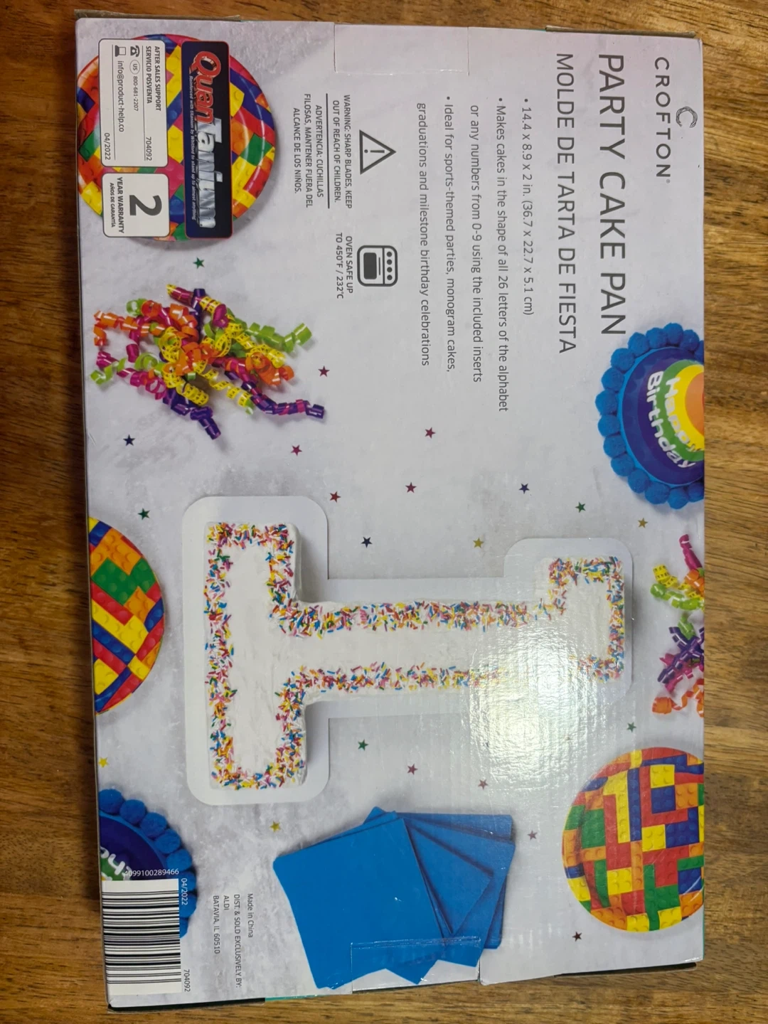 Crofton Party Cake Pan makes every number and letter! It makes cakes in the shape of all 26 letters of the alphabet or any numbers from 0-9 using the included inserts. Ideal for sports themed parties, monogram cakes, graduations and milestone birthday celebrations