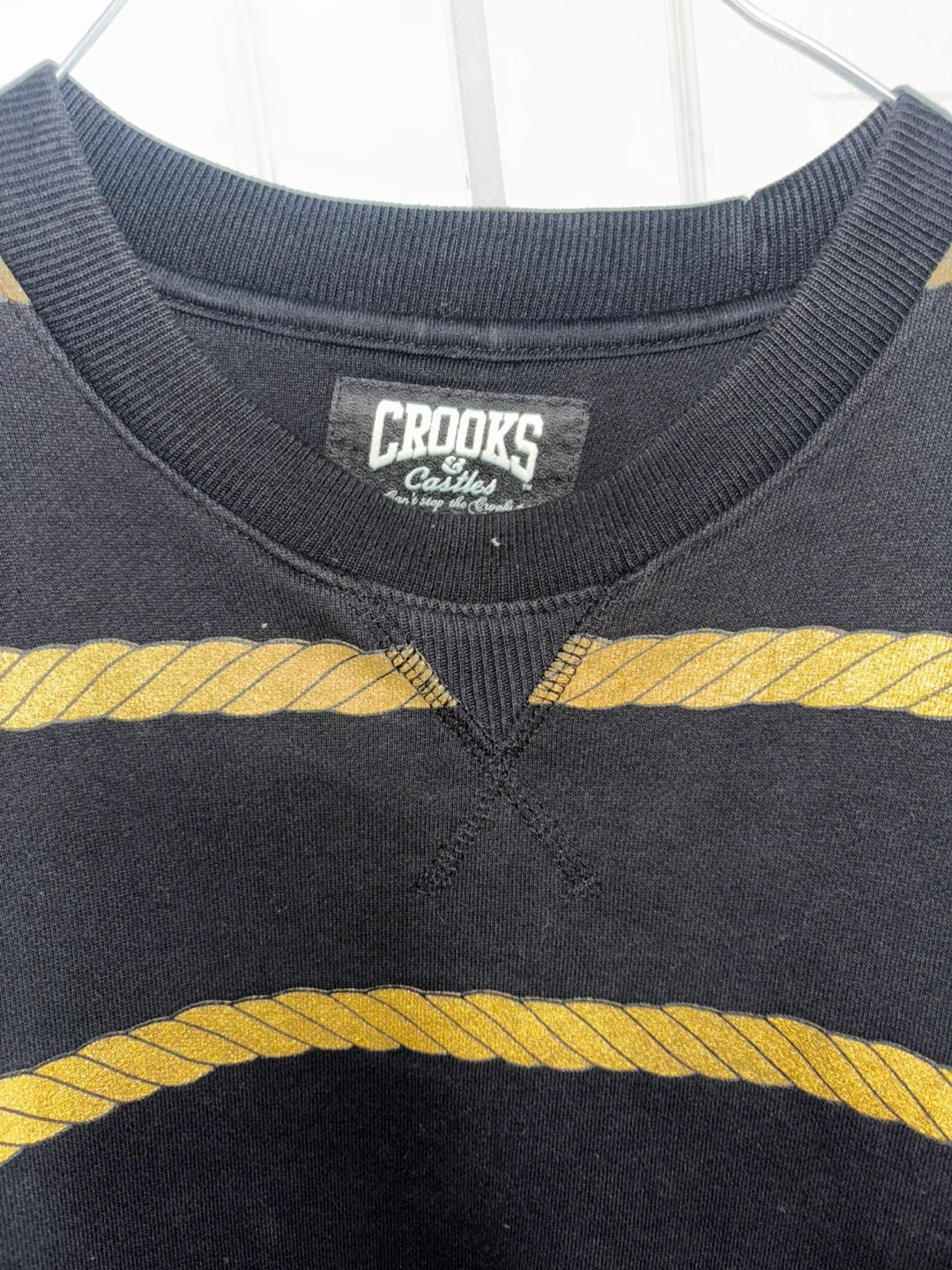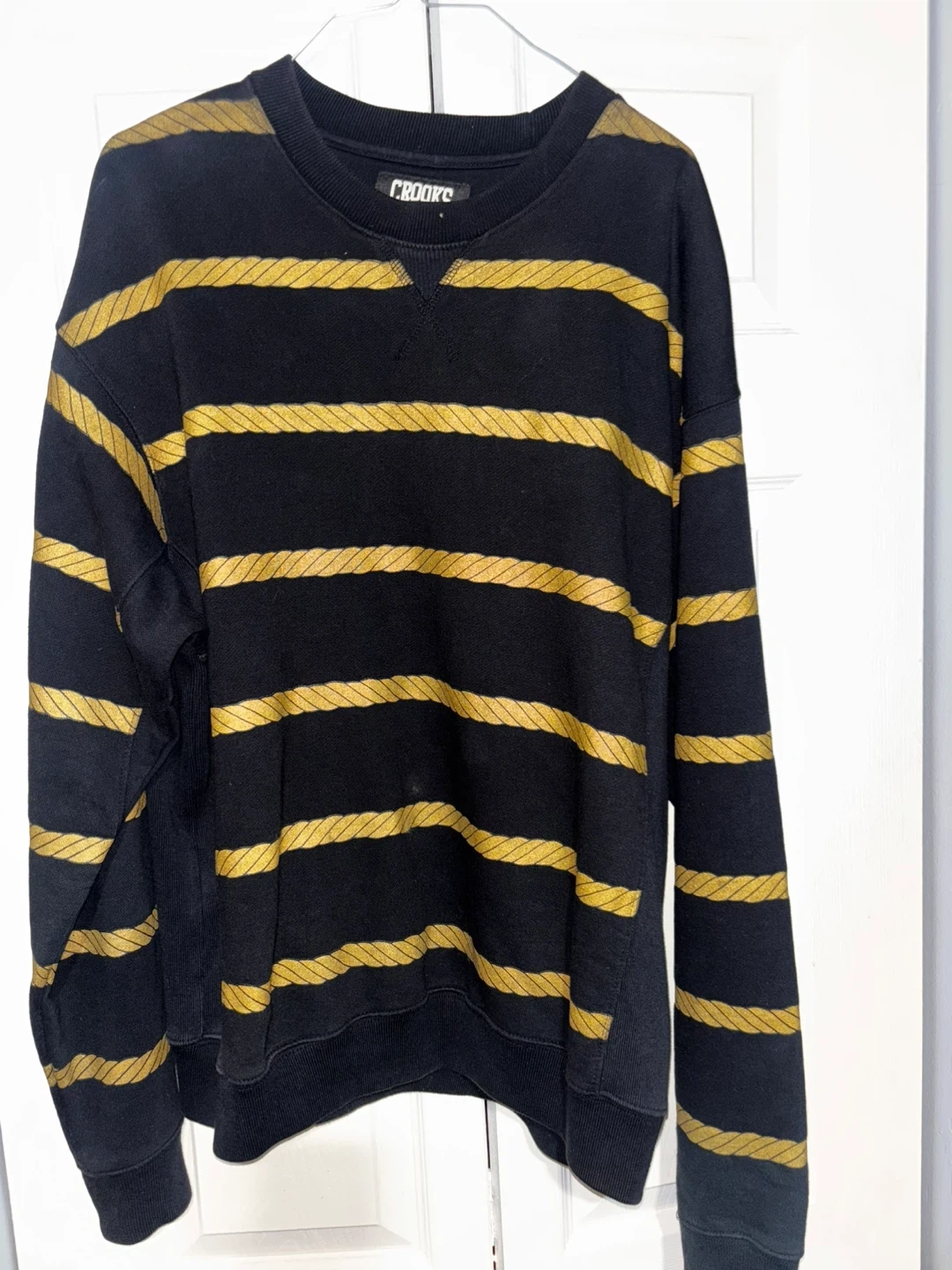 65Selling a Crooks & Castles sweatshirt! It features a black base with gold stripes. Perfect for a casual and stylish look