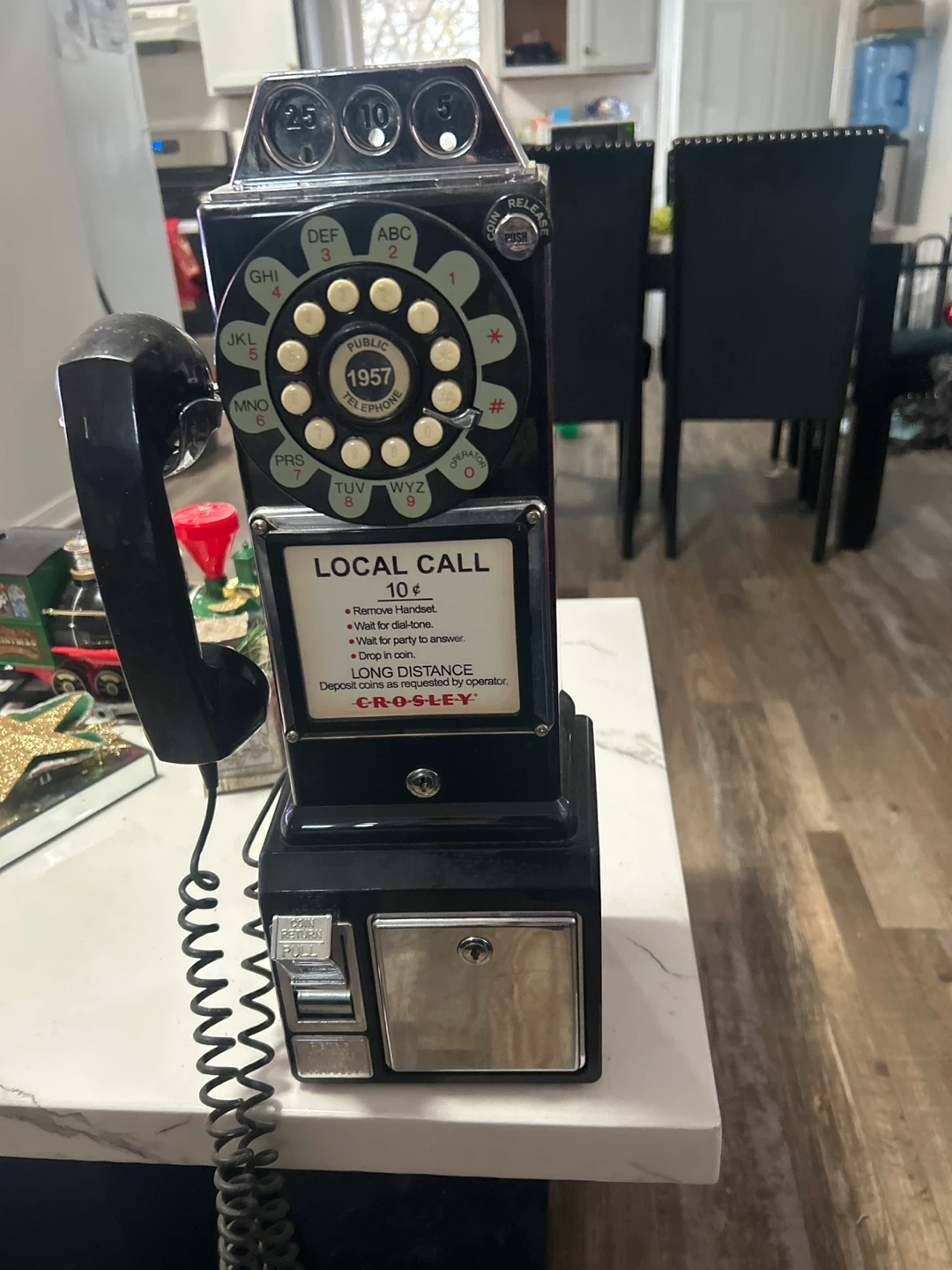 10Selling a Crosley 1957 replica payphone! It's a really cool piece. It says 'LOCAL CALL 10¢' on the front, with instructions on how to use it. It has a coin slot and return. The phone itself has the classic rotary dial. The brand is Crosley.