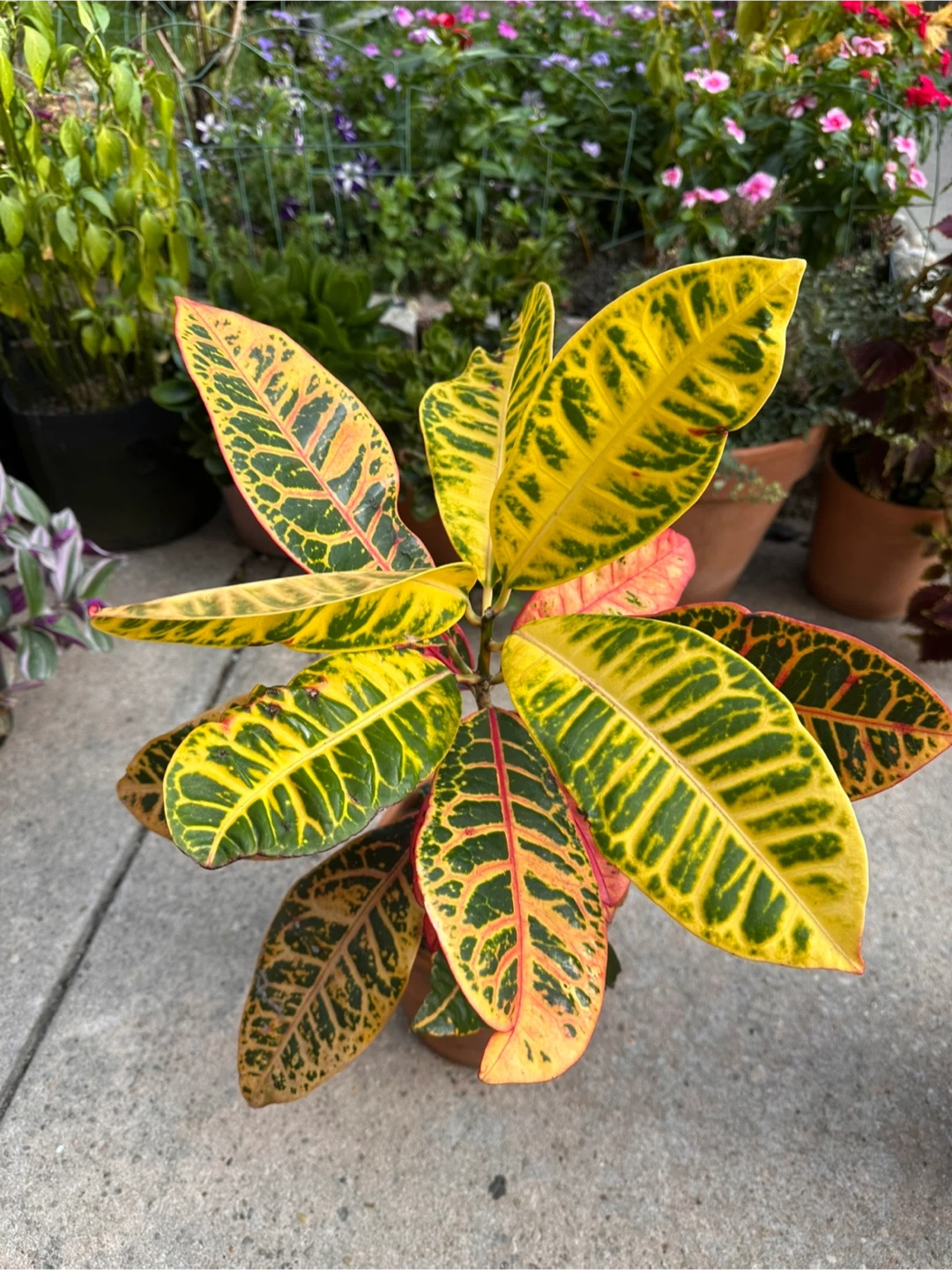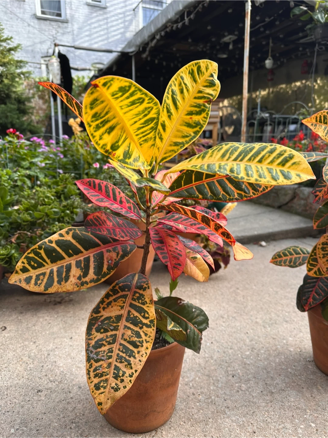 10Selling a vibrant Croton plant! It has colorful leaves, a mix of red, yellow, and green. It's in a terracotta pot and ready to brighten up your space