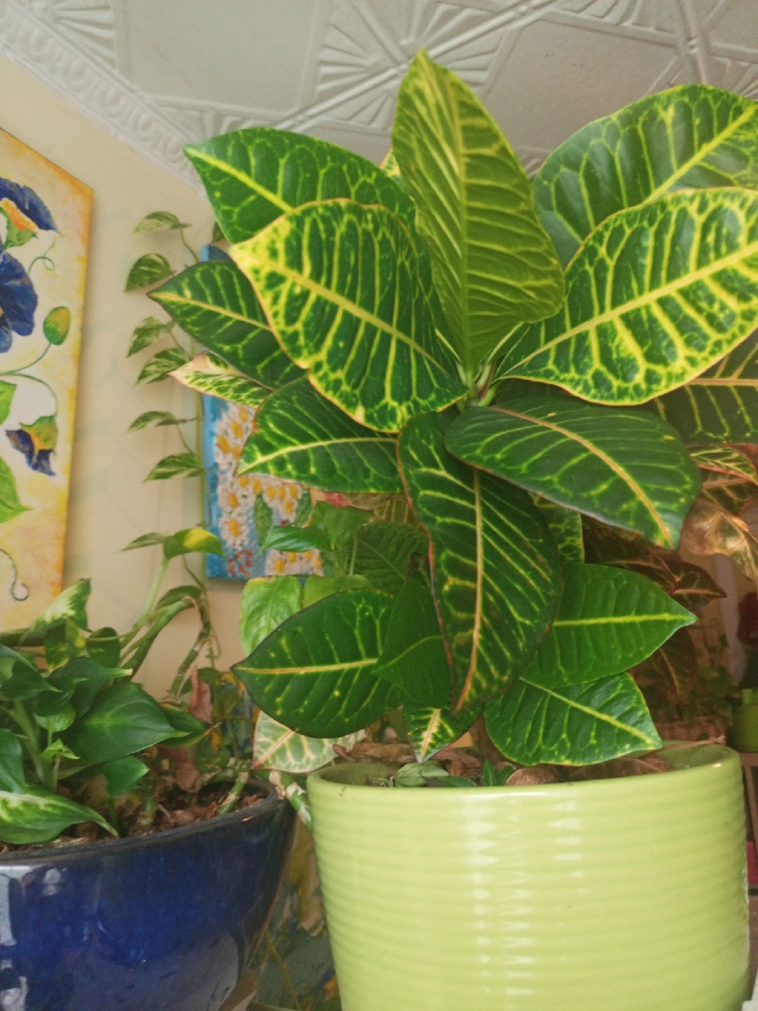 33Selling a vibrant Croton plant in a light green pot! It's a beautiful addition to any indoor space with its striking variegated leaves