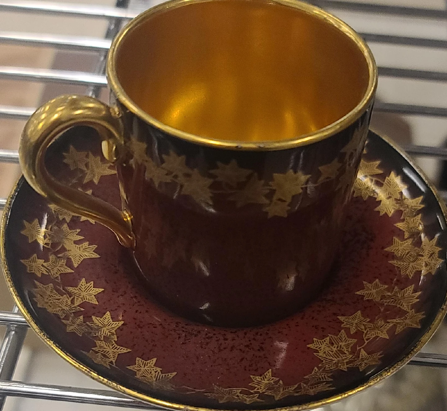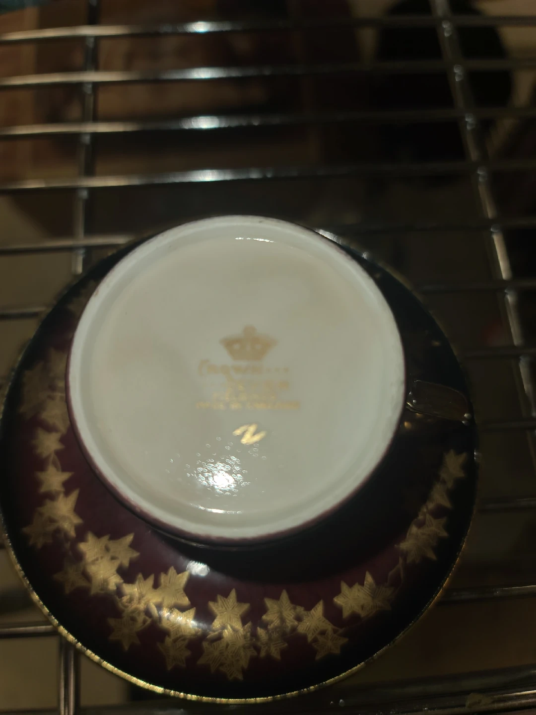26Selling a beautiful Crown Lynn demitasse cup and saucer. It features a stunning gold interior and gold star accents on a maroon background. Perfect for adding a touch of elegance to your coffee or tea time