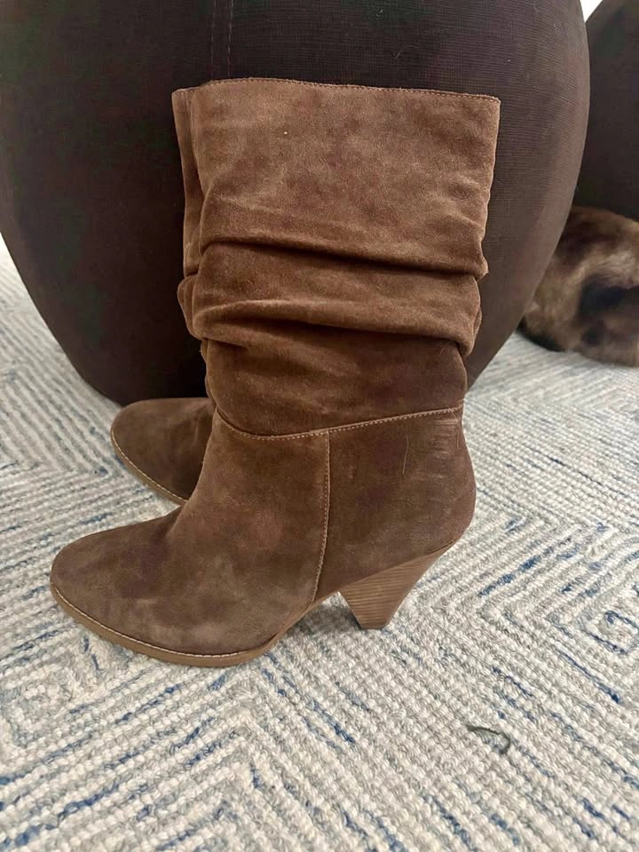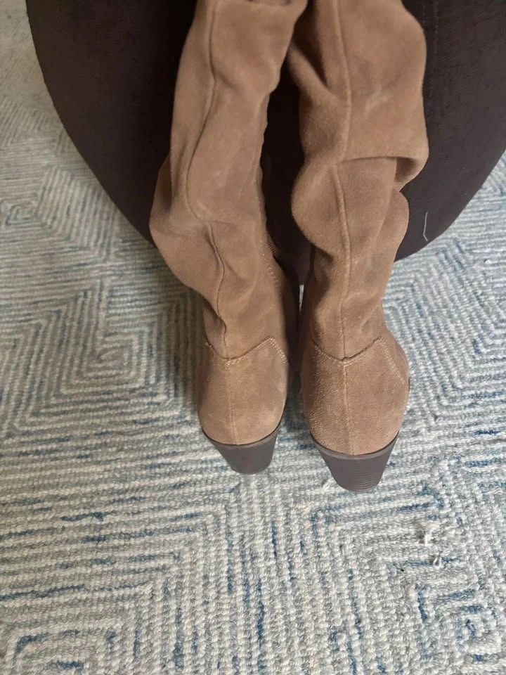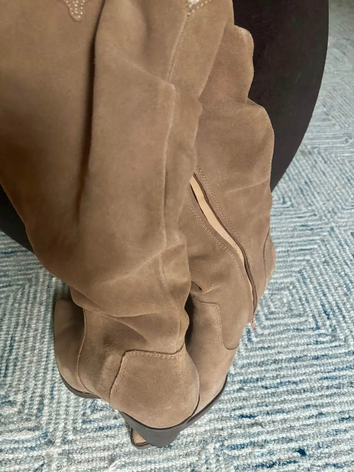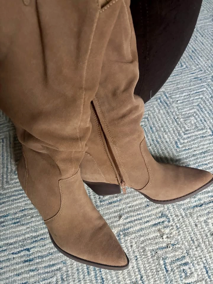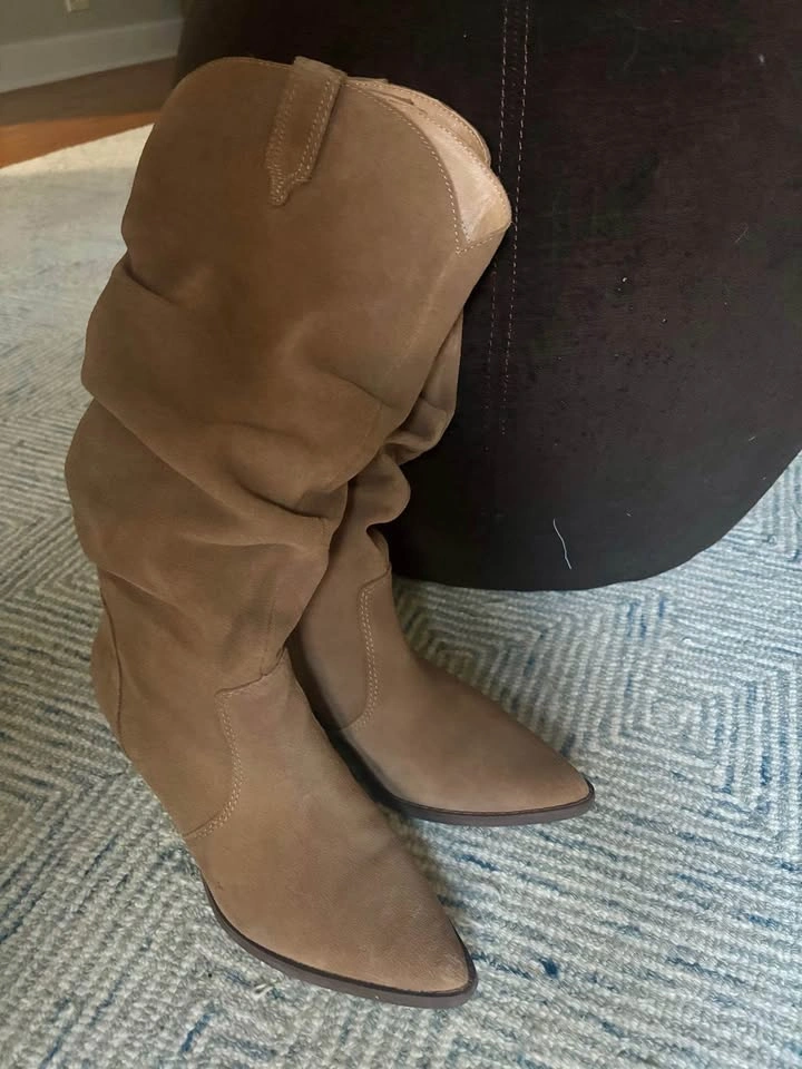 10Just-below-knee-high boots. 9.5. Refined Western flair/cowboy-inspired style. Light-brown suede upper. Slight slouch that doesn’t fall, perfect a casual day out or a night on the town.