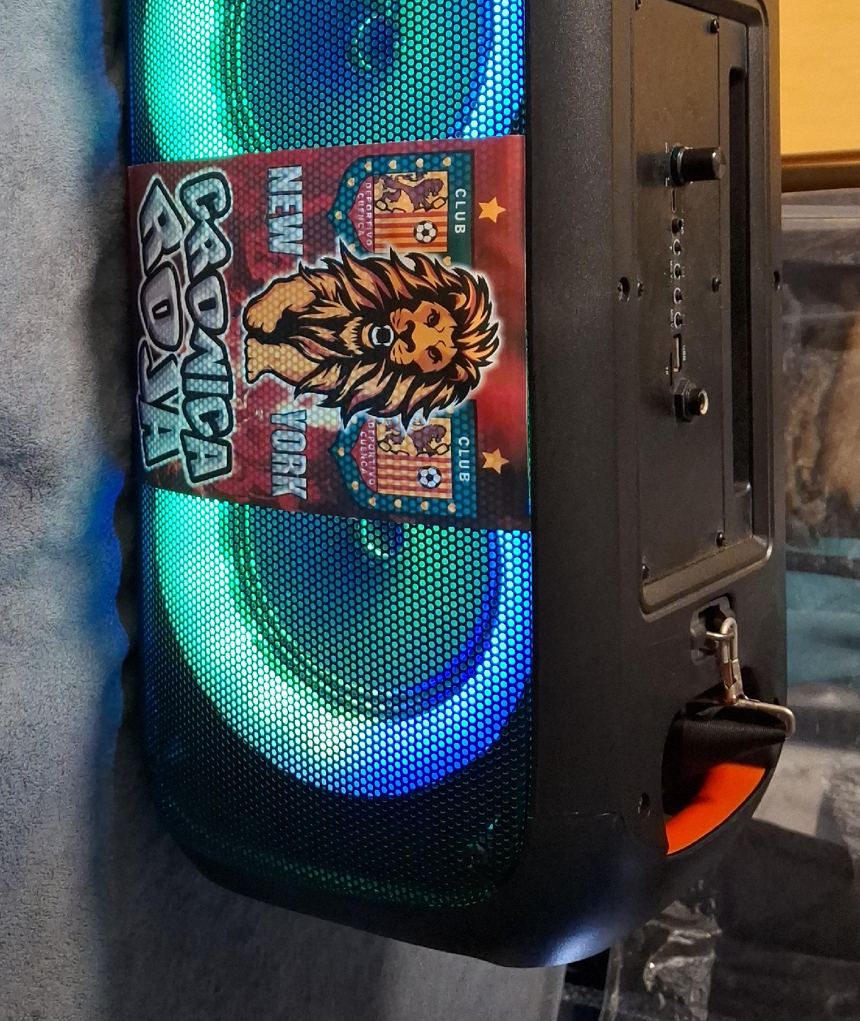 Selling a Croxica New York Club speaker! It has a cool design with a lion and soccer balls, and the lights look really neat. The back says 'BASS', so you know it's got some power. Perfect for parties or just listening to your favorite tunes