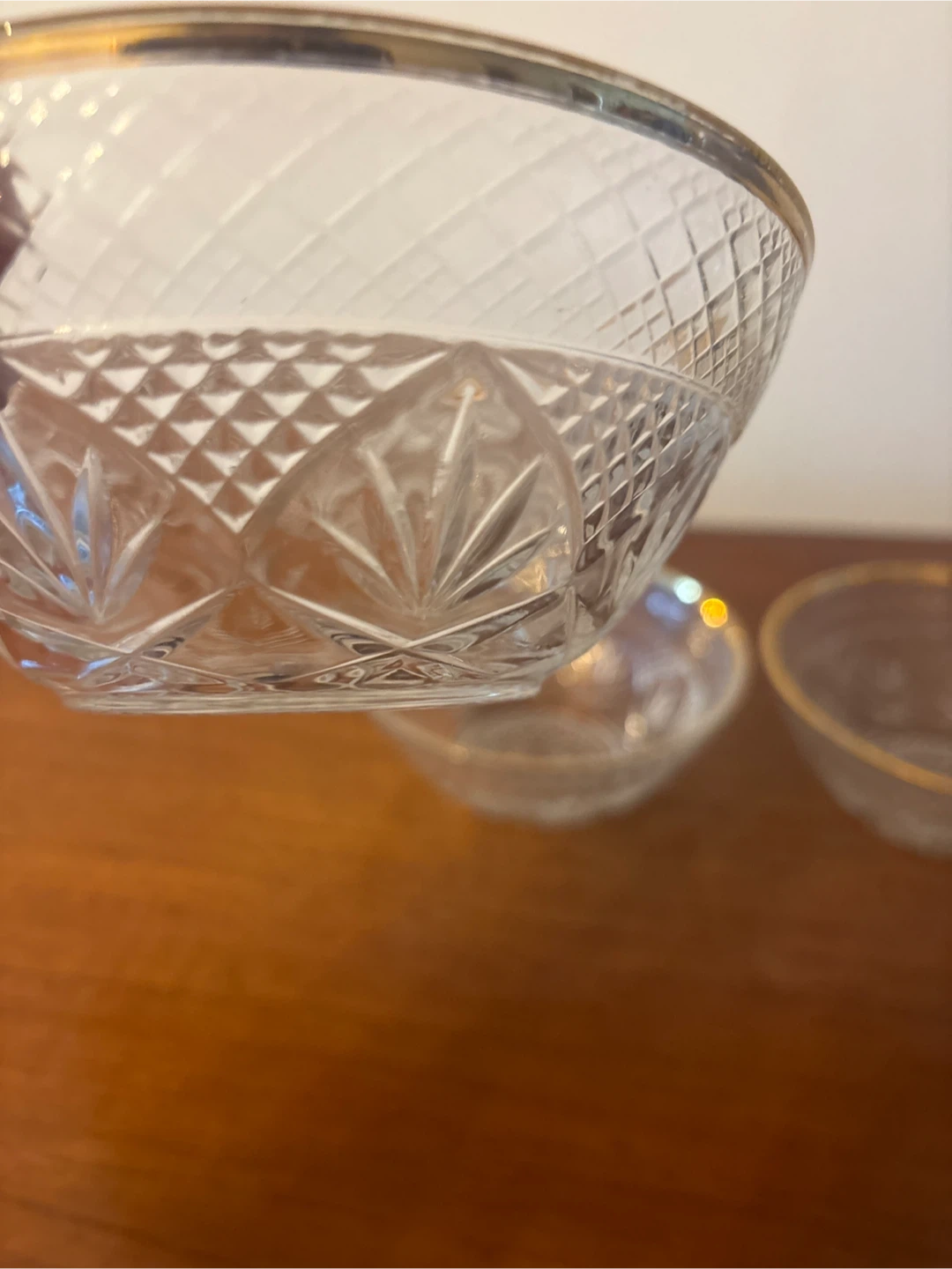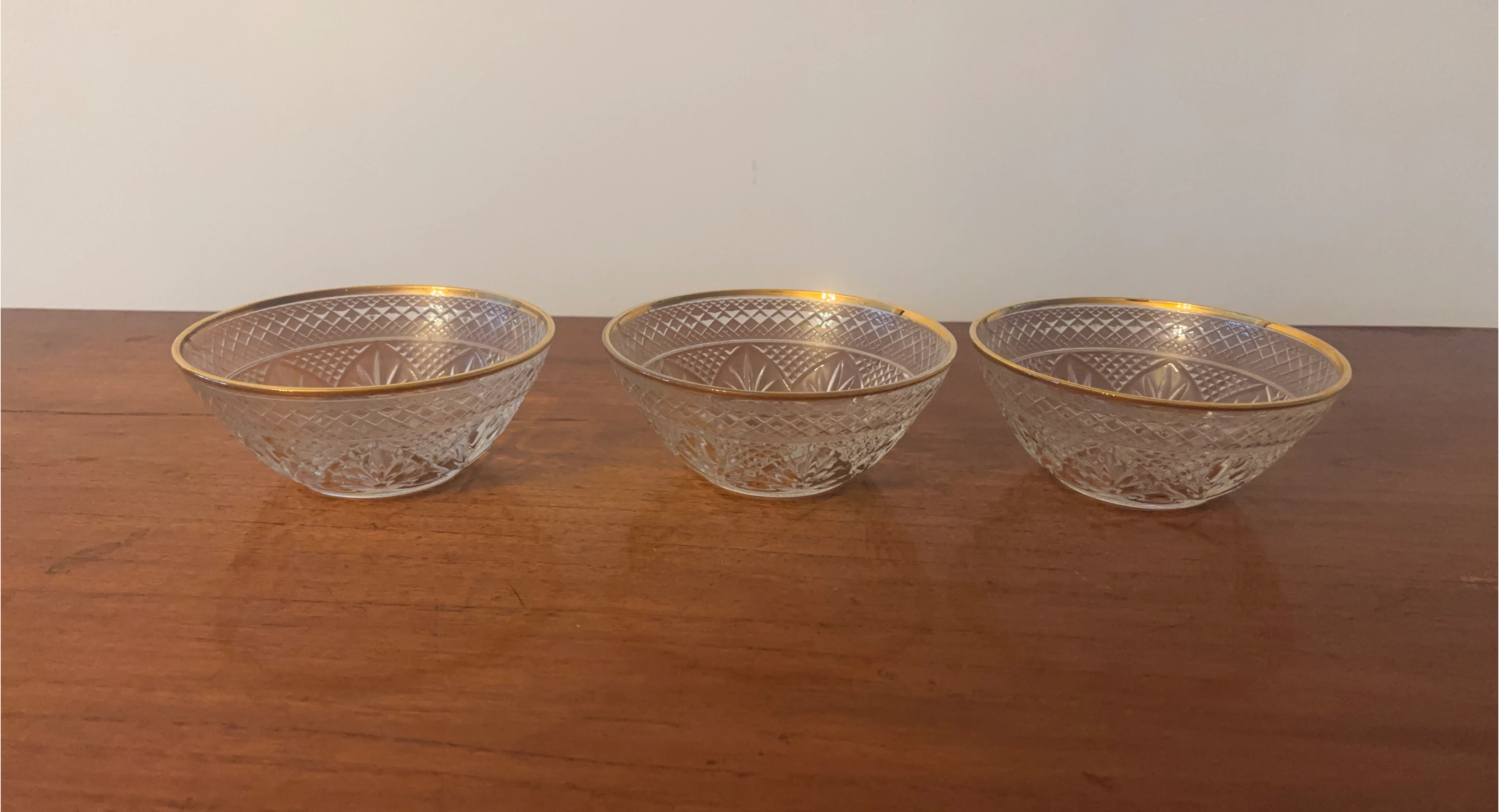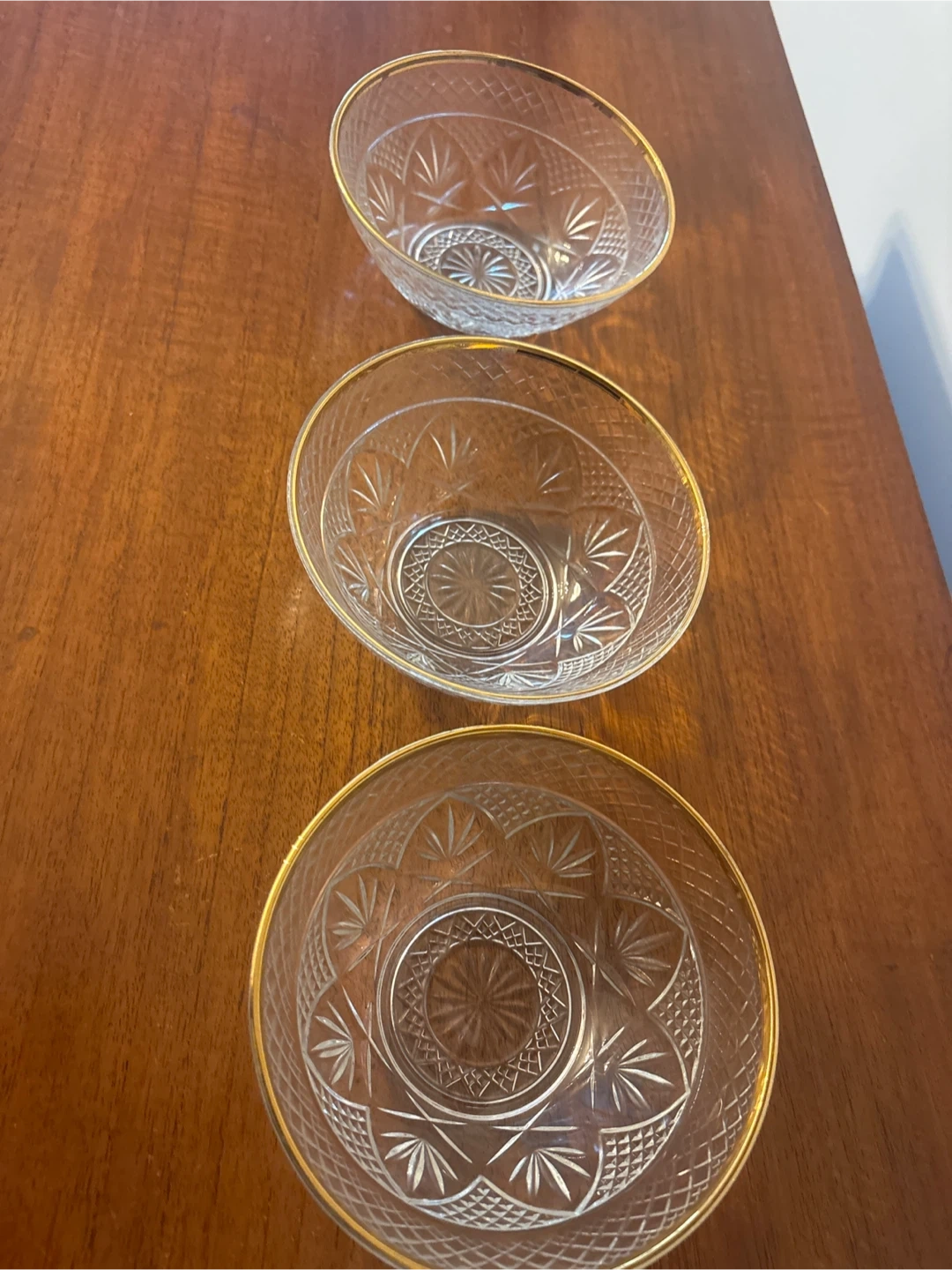Selling a set of three crystal bowls, each with a delicate gold trim. They feature a beautiful, intricate design that catches the light nicely. These bowls are perfect for serving snacks, desserts, or as decorative pieces in your home
