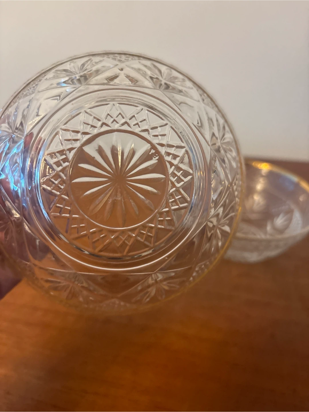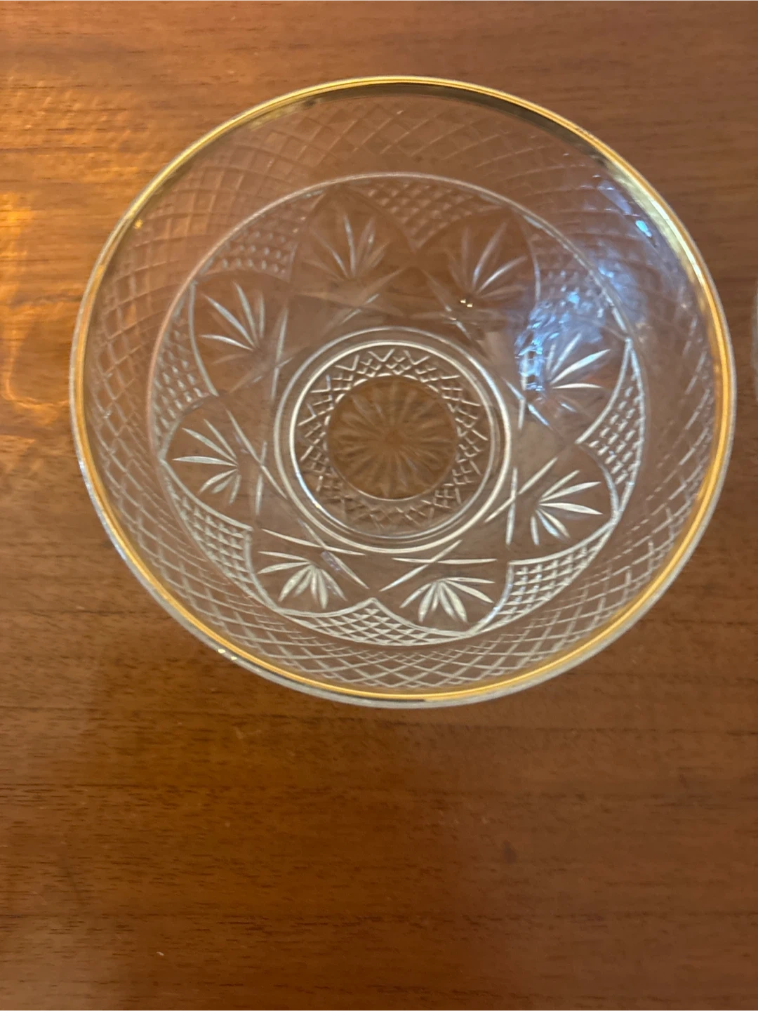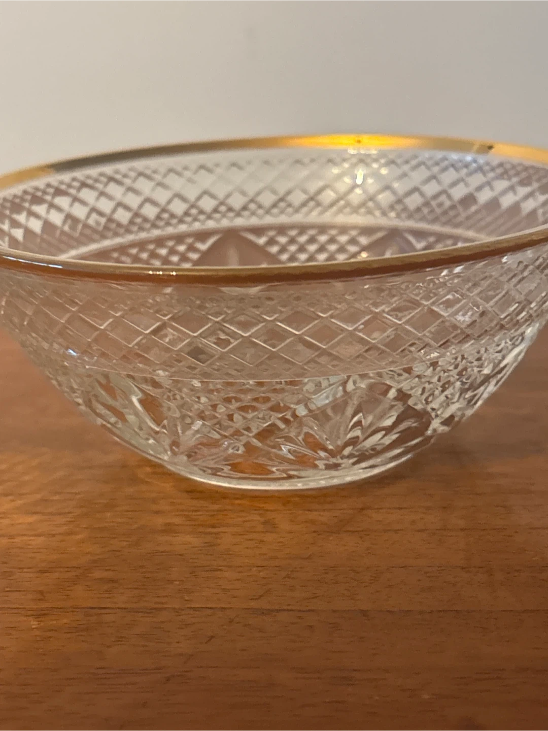 Selling a set of three crystal bowls, each with a delicate gold trim. They feature a beautiful, intricate design that catches the light nicely. These bowls are perfect for serving snacks, desserts, or as decorative pieces in your home