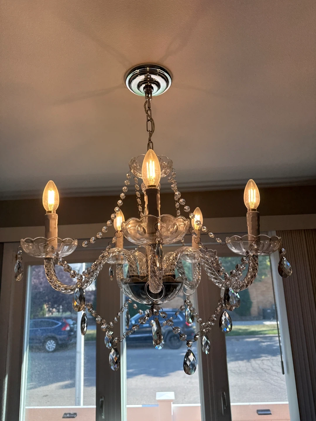 Selling a beautiful crystal chandelier! It adds a touch of elegance to any room. The chandelier is in great condition and features sparkling crystal accents.