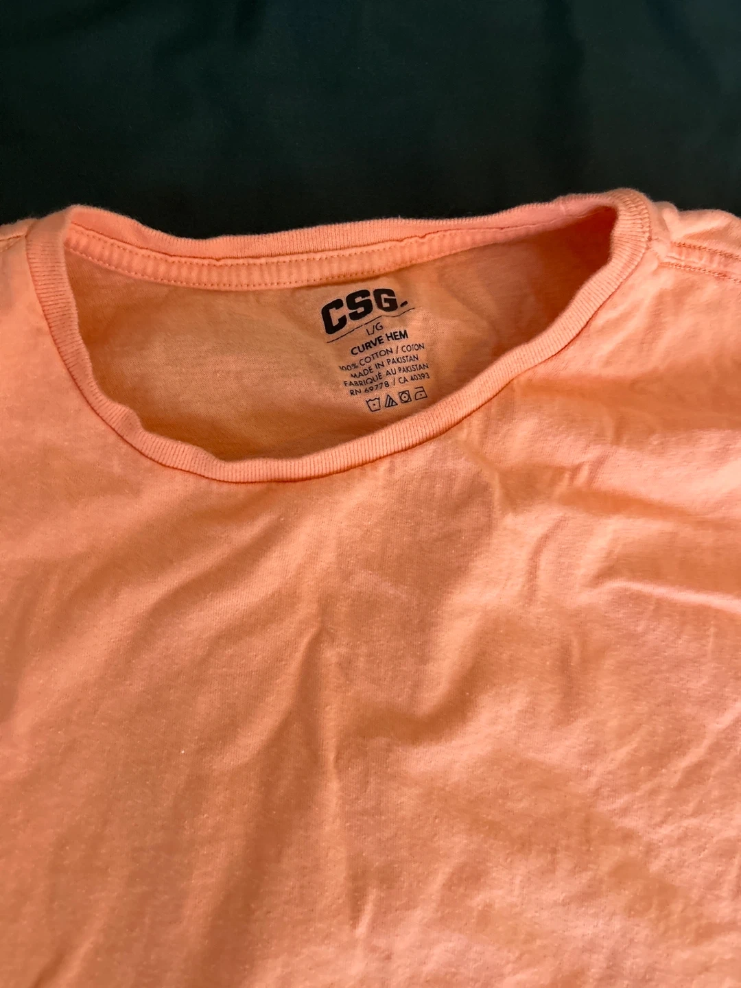748a CSG Curve Hem t-shirt in a lovely peach color. It's a size large and made of 100% cotton. Perfect for everyday wear!