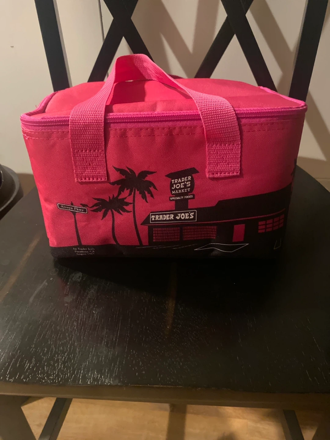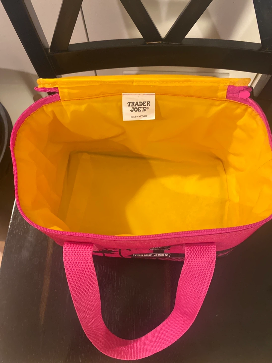 This is a Trader Joe's insulated lunch bag. It's pink with a black silhouetted design of palm trees and a building. The interior is bright yellow with a zippered closure. Made in Vietnam.