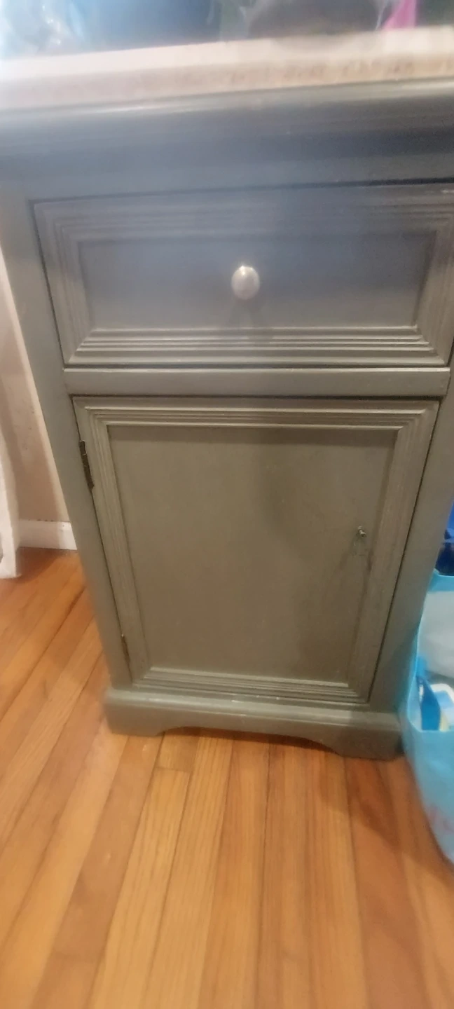 This gray nightstand features a single drawer and a cabinet door for storage. It has a classic design with two silver handles just placed upon it