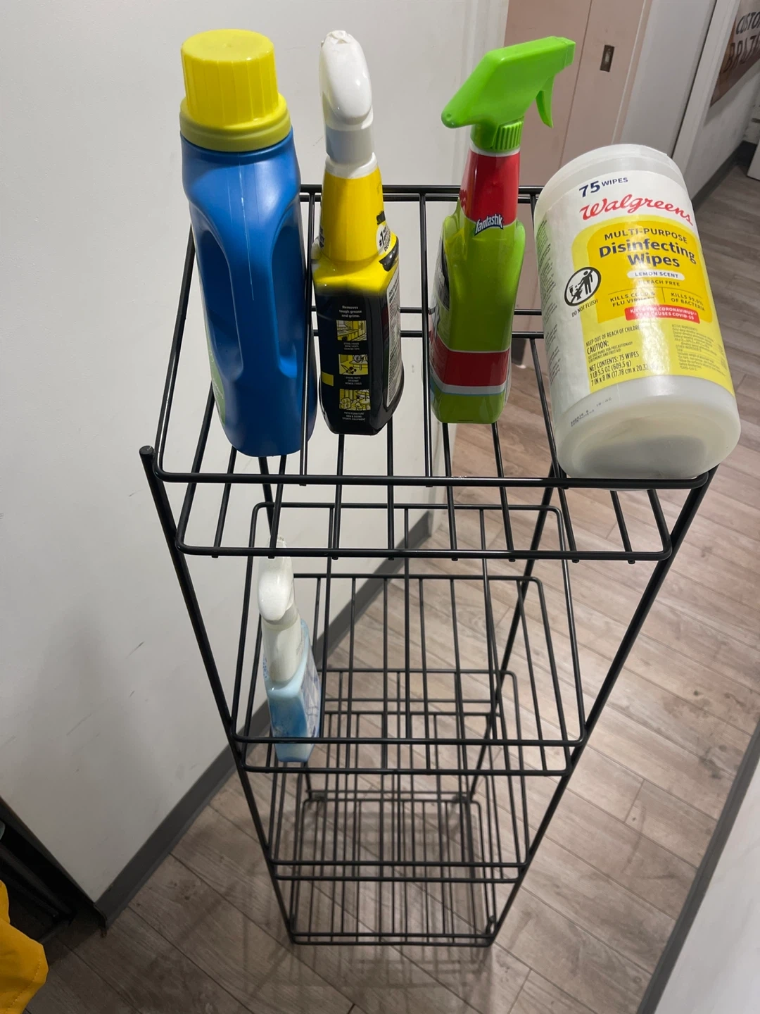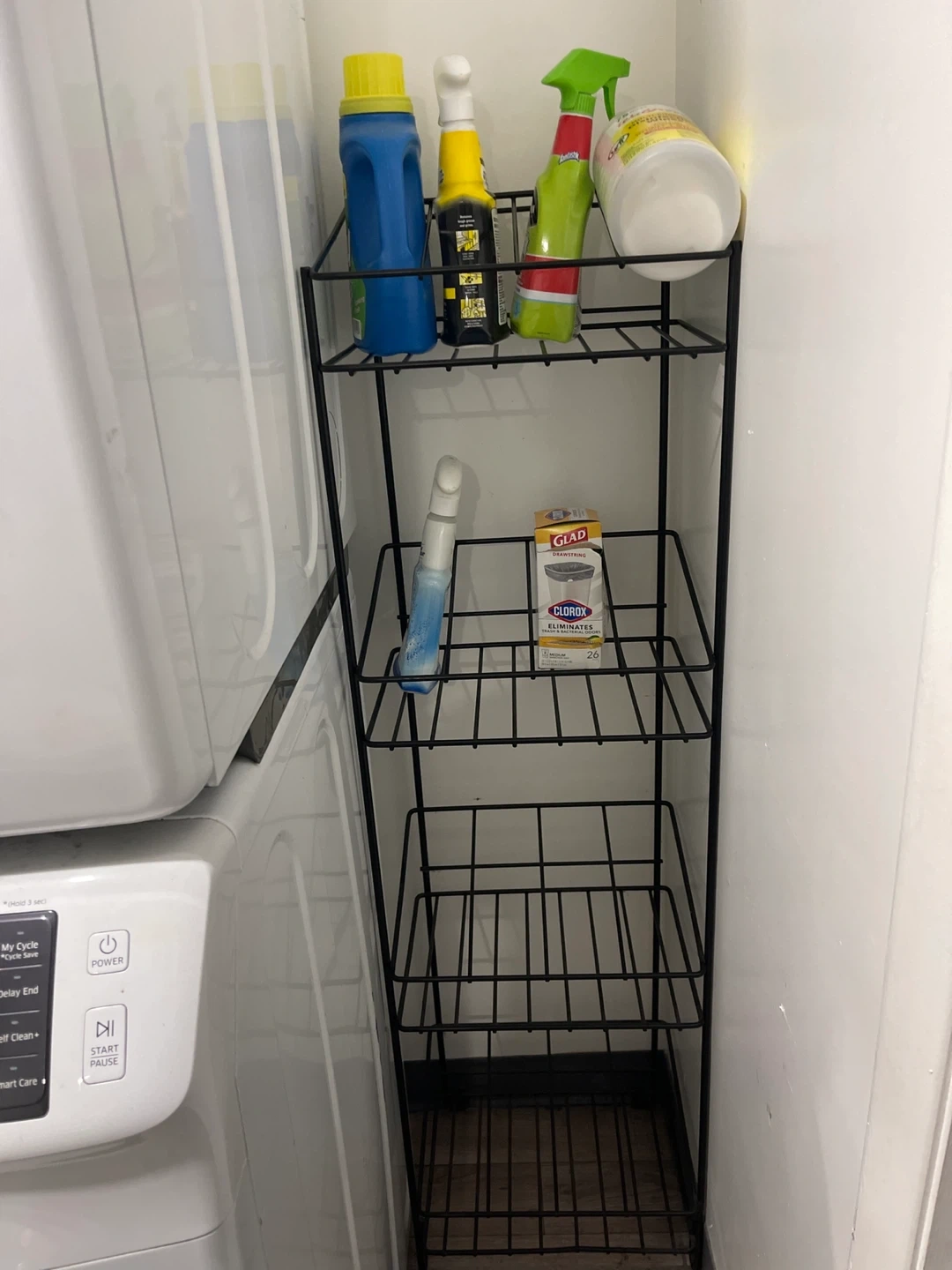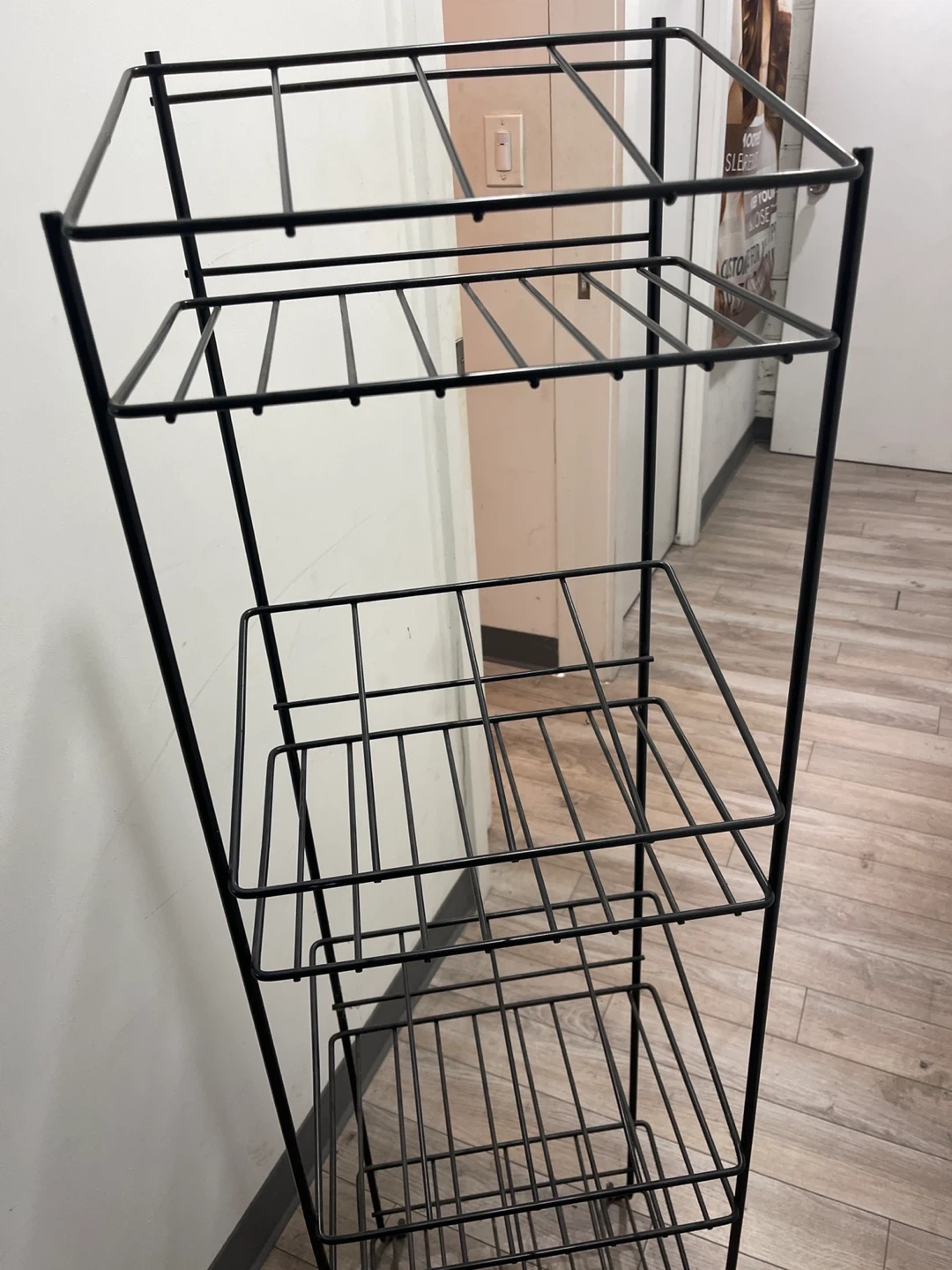 This is a black metal wire storage shelf unit. It has four tiers for organization. Its slim design is great for narrow spaces!or for the bottles of wine 🍷