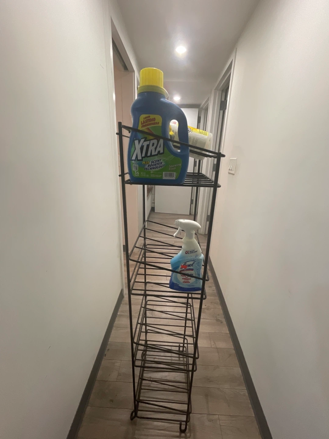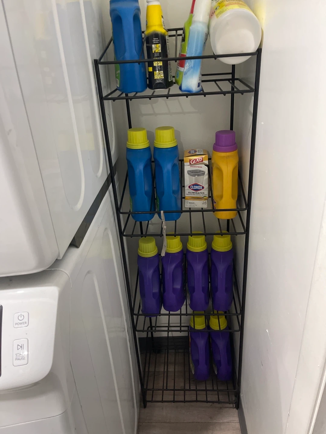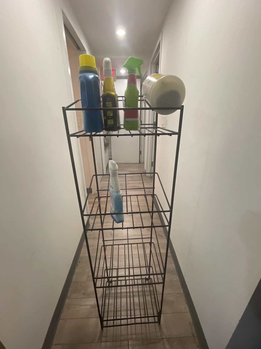 This is a black metal wire storage shelf unit. It has four tiers for organization. Its slim design is great for narrow spaces!or for the bottles of wine 🍷
