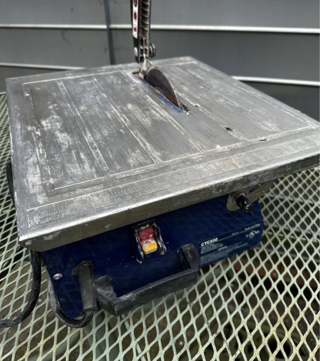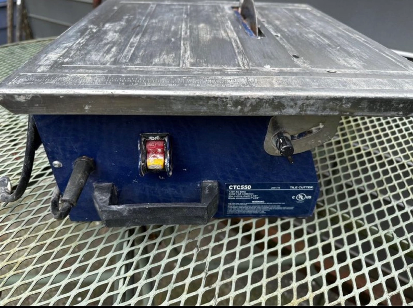 Tile cutter with a metal blade, motor and a metal table with a safety guard. Use only in a job in my house.