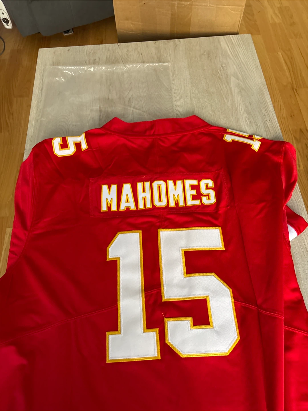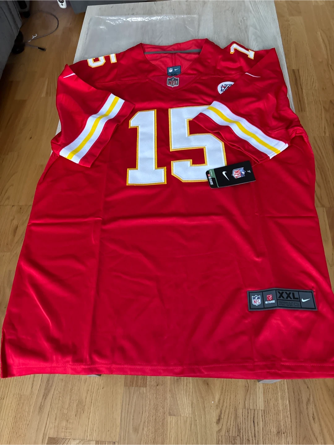 Selling new never used Kansas City Chiefs jersey with Mahomes' number 15 on it! The size is XXL. Great for any Chiefs fan!