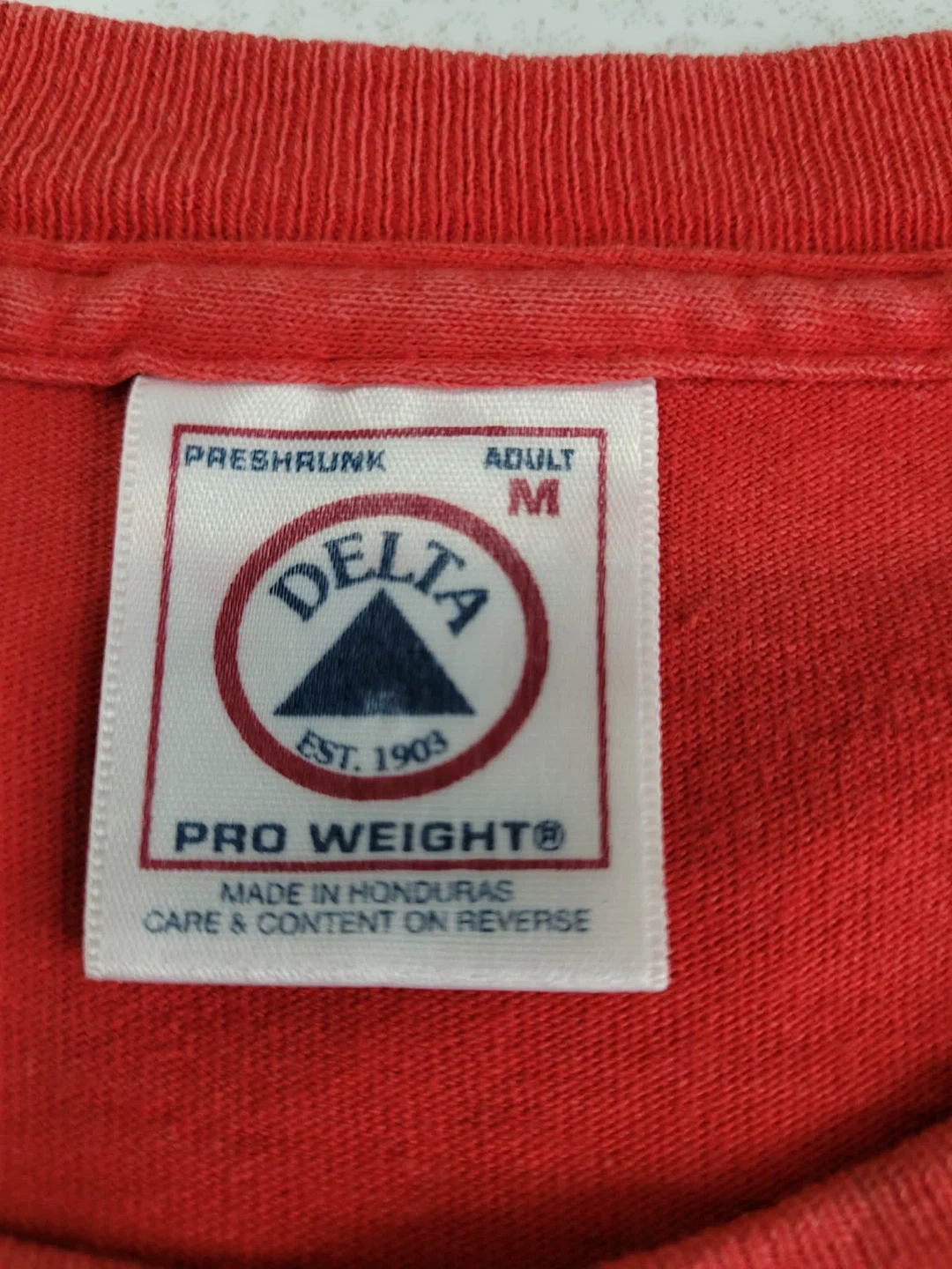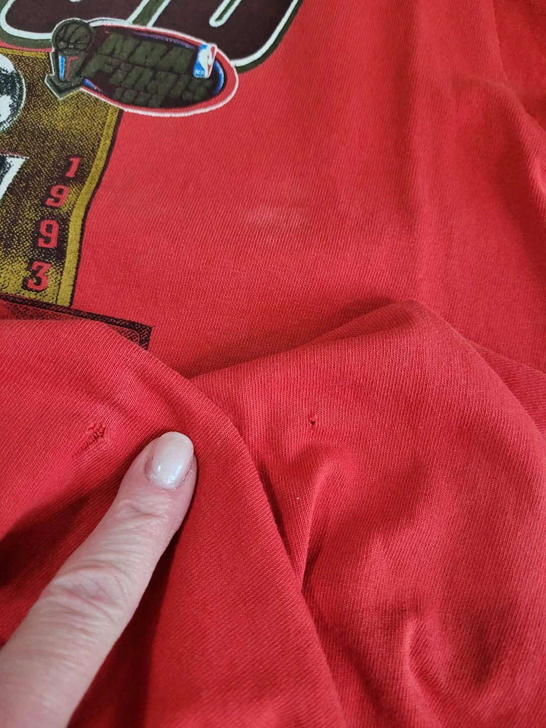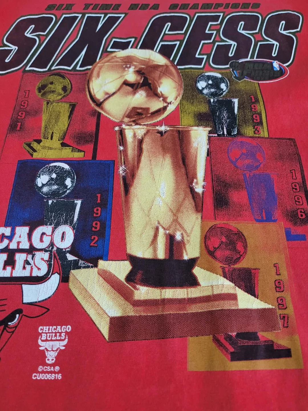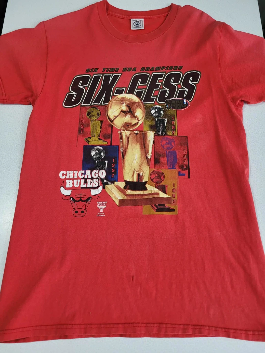 Red graphic tee celebrating the Chicago Bulls' six NBA championships. Adult size medium, made of pre-shrunk cotton. Shows some minor signs of wear with small marks on the fabric.