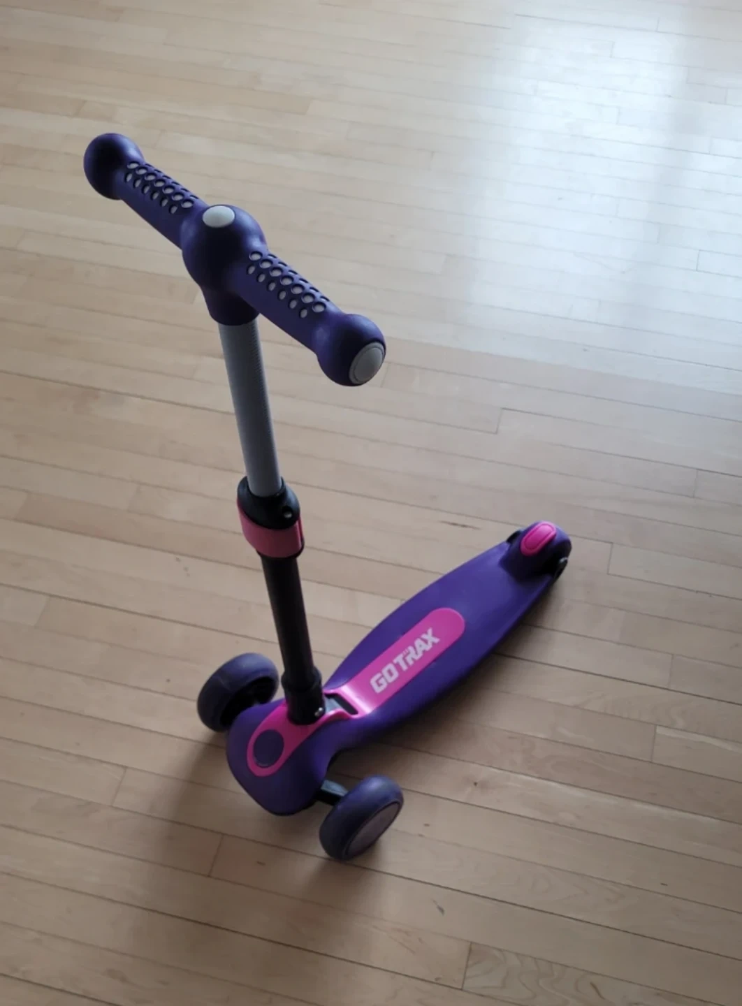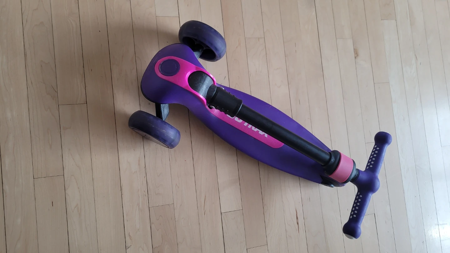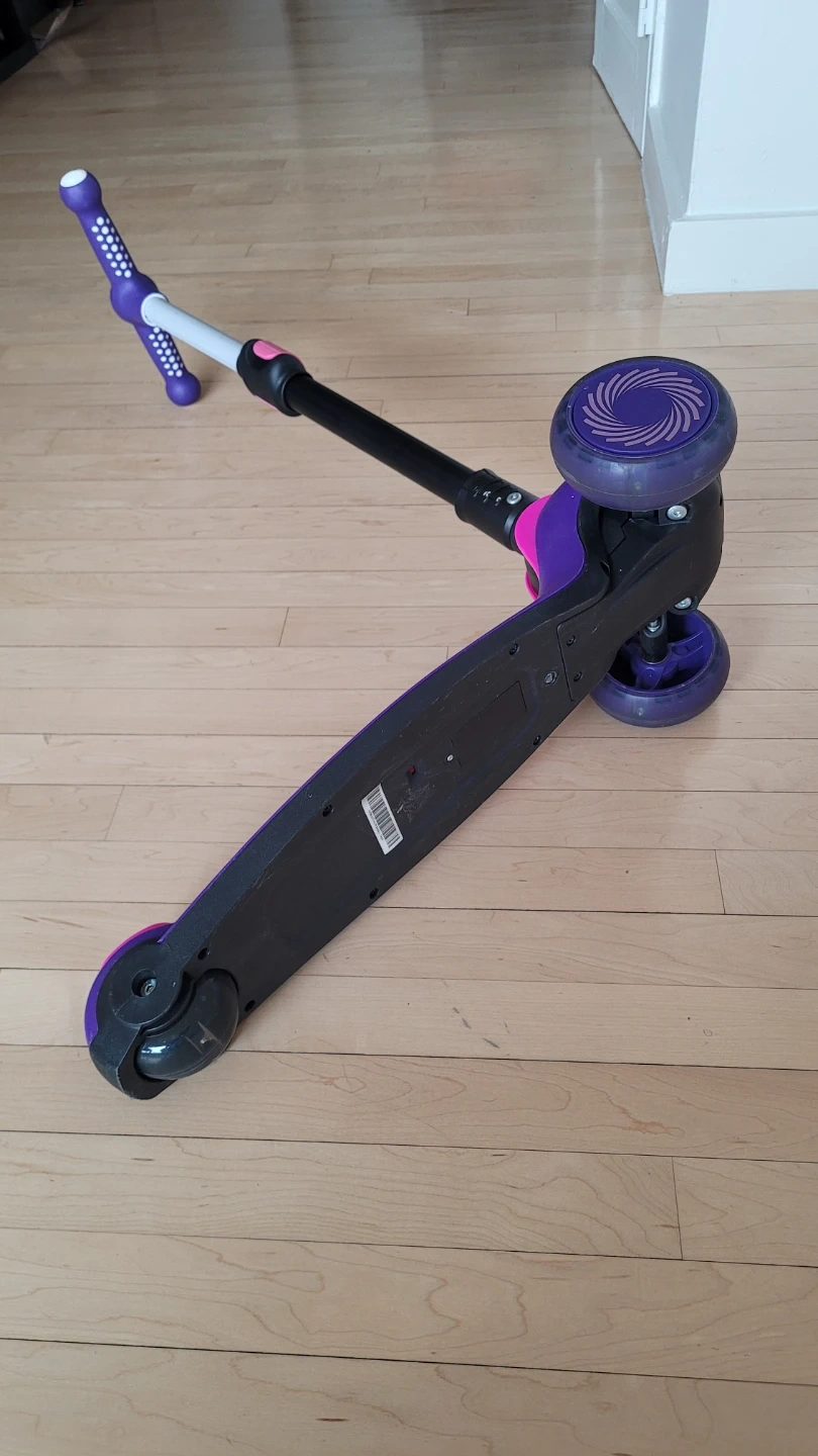 This GOTRAX 3-wheeler scooter is purple and pink. It's designed for kids, usually between 2 and 6 year old. The handlebars are adjustable for growing riders and the scooter is foldable.