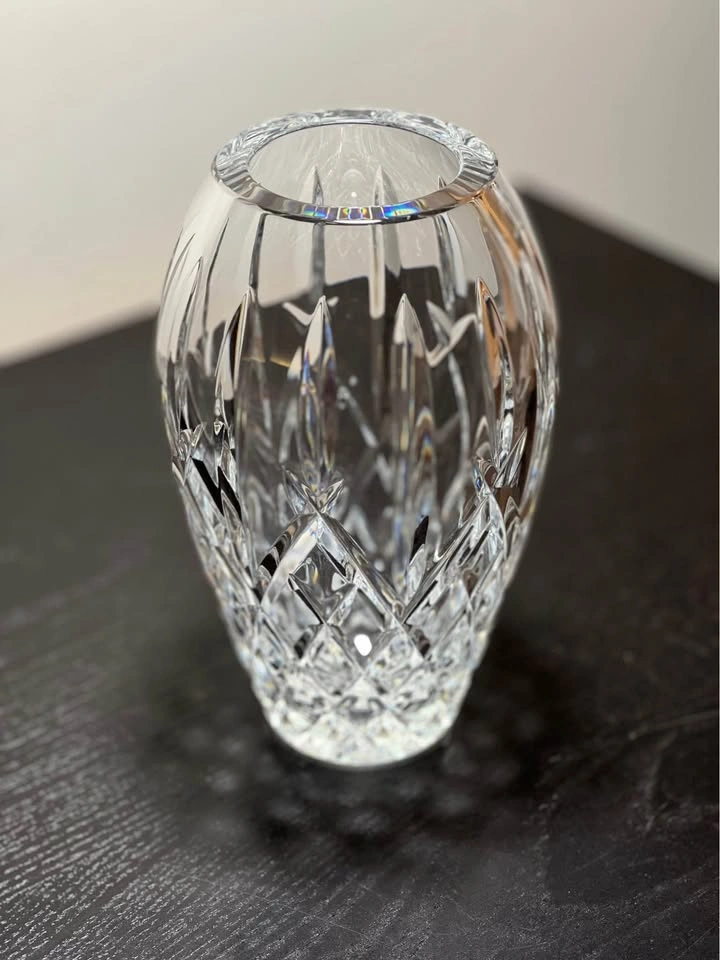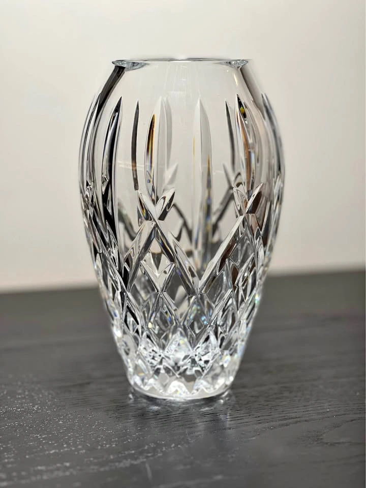 This is a Waterford Crystal Araglin 7” vase. This pattern, introduced in 1987, is known for its classic design featuring a combination of diamond and vertical wedge cuts that create a brilliant, light-reflecting finish.