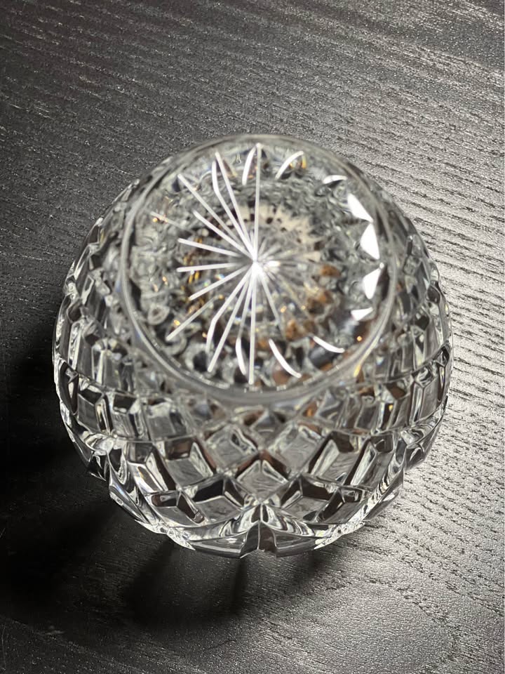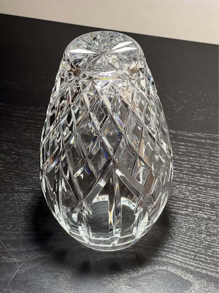 This is a Waterford Crystal Araglin 7” vase. This pattern, introduced in 1987, is known for its classic design featuring a combination of diamond and vertical wedge cuts that create a brilliant, light-reflecting finish.