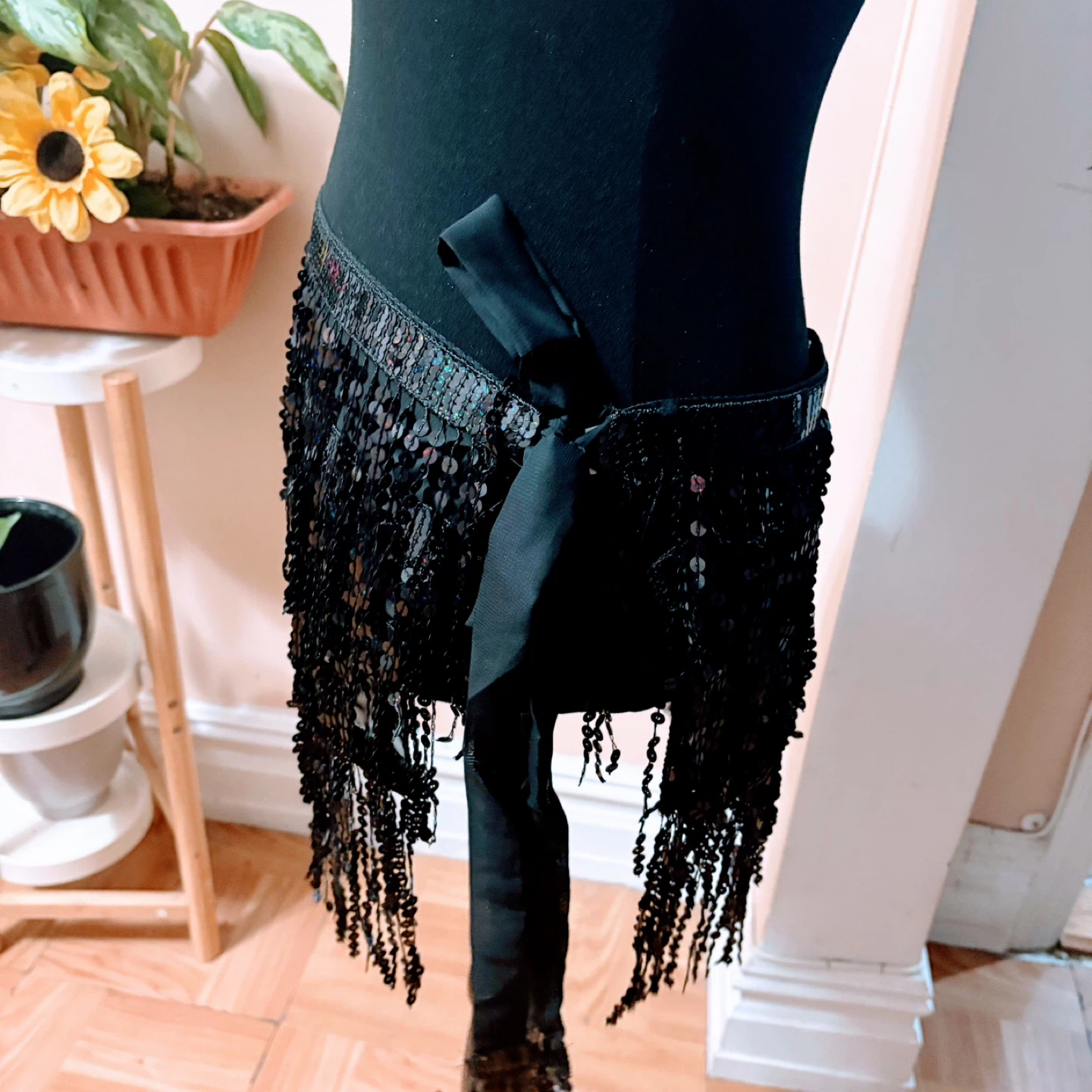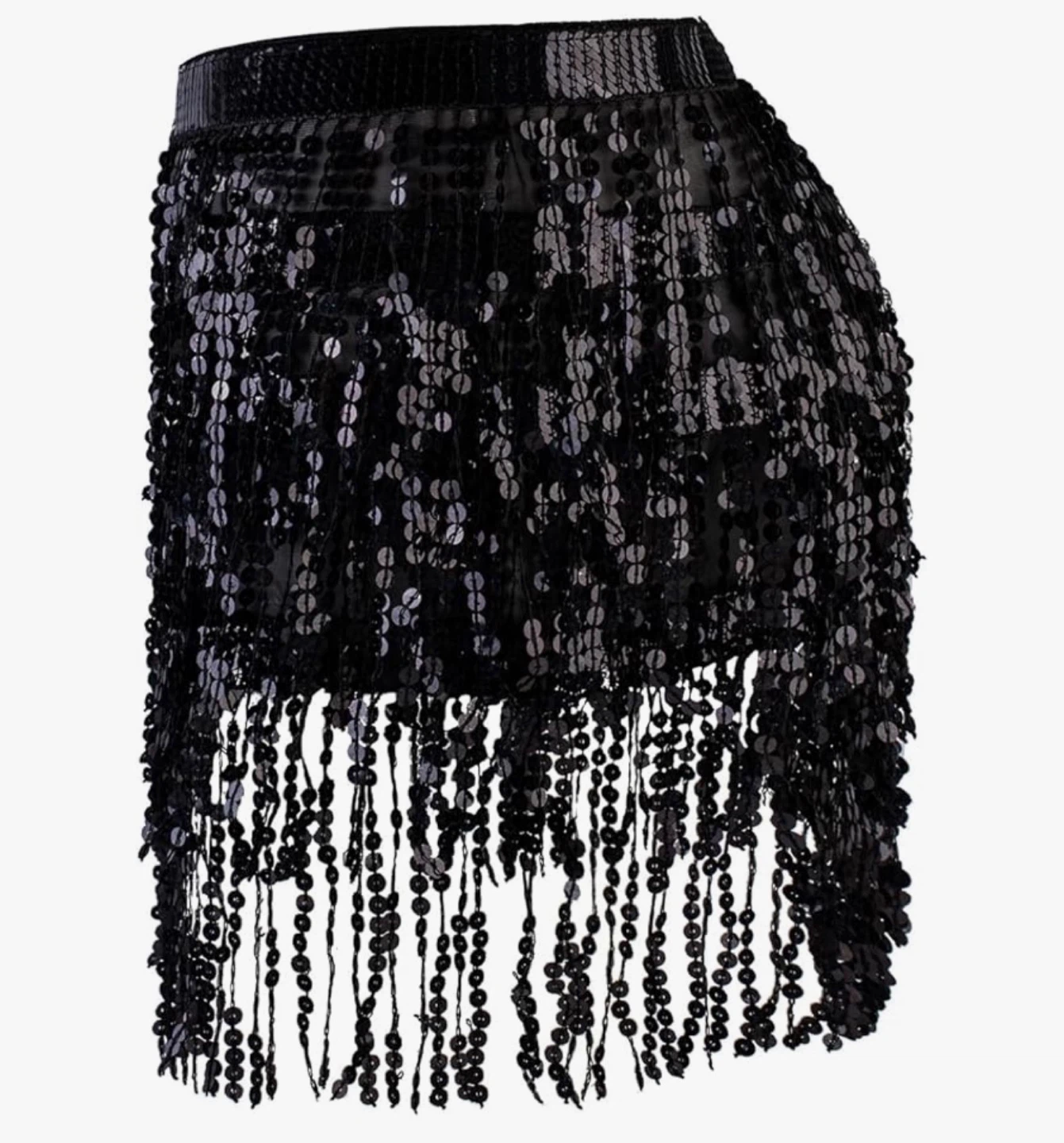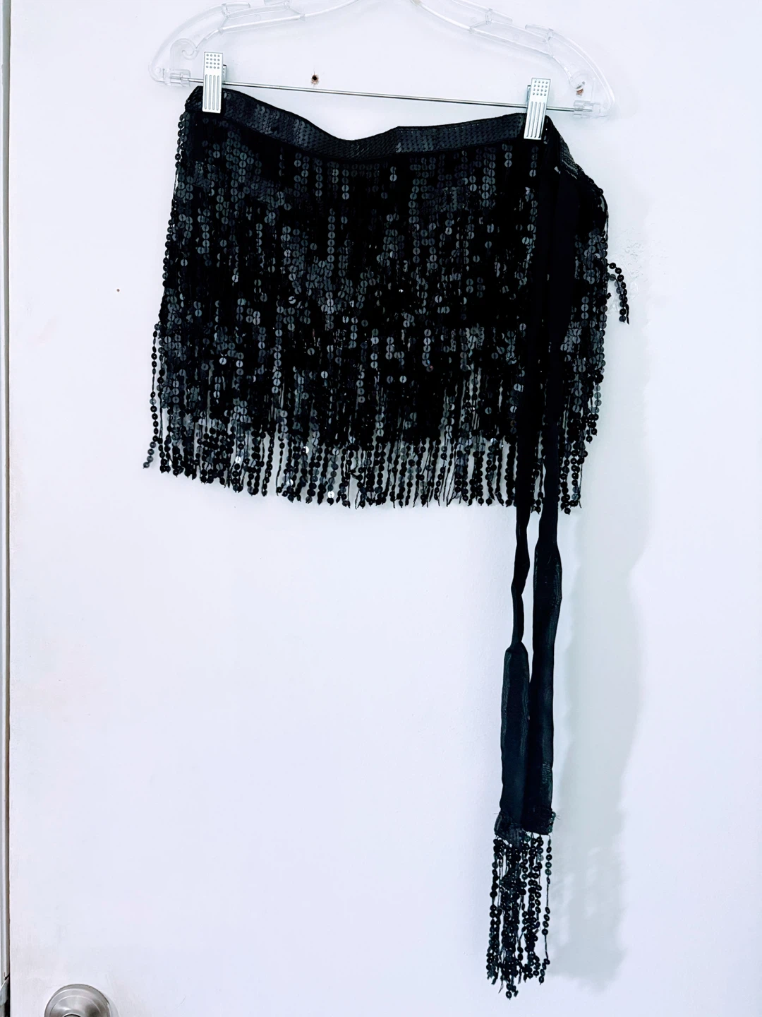 Sparkly black sequin fringe skirt. It has a beaded fringe detail and ribbon tie closure. Great for dancing or parties!