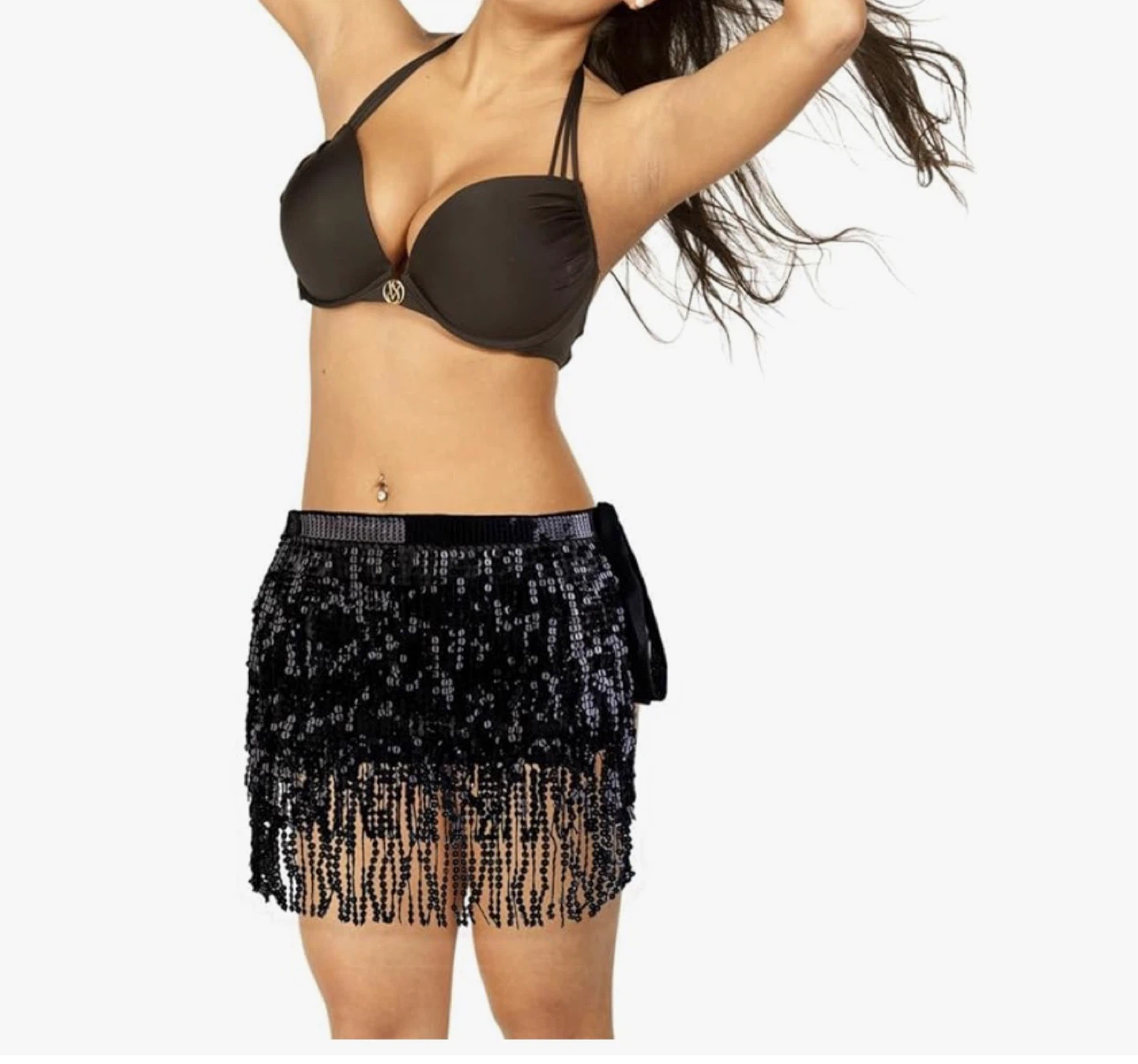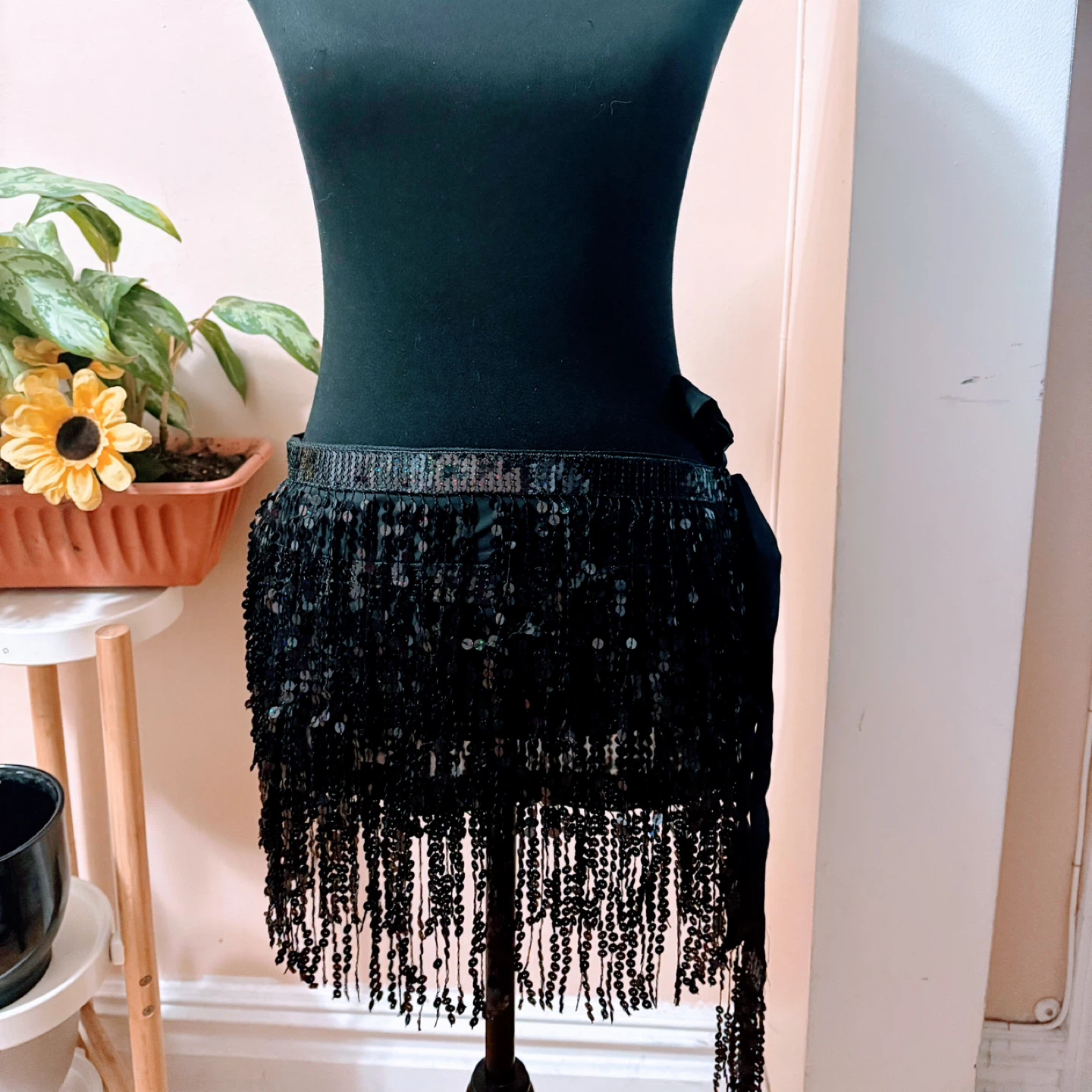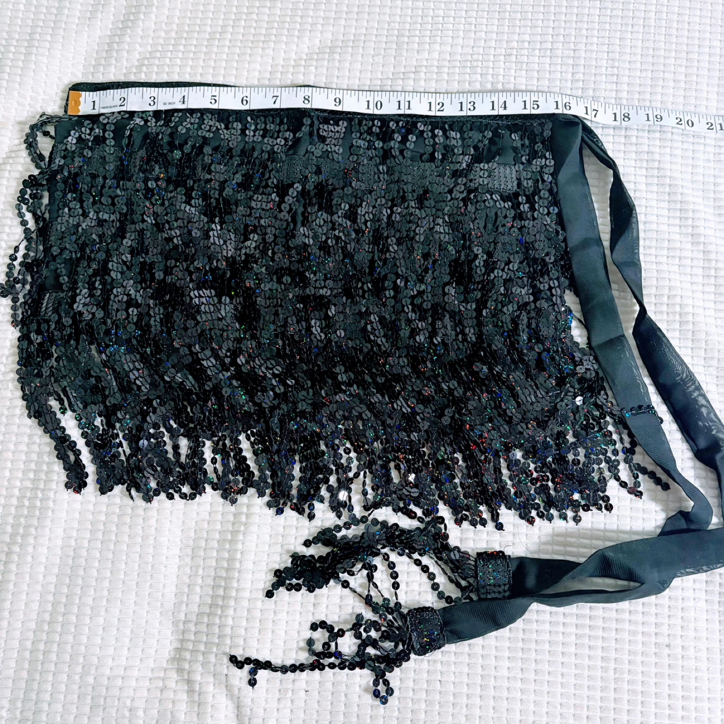 Sparkly black sequin fringe skirt. It has a beaded fringe detail and ribbon tie closure. Great for dancing or parties!