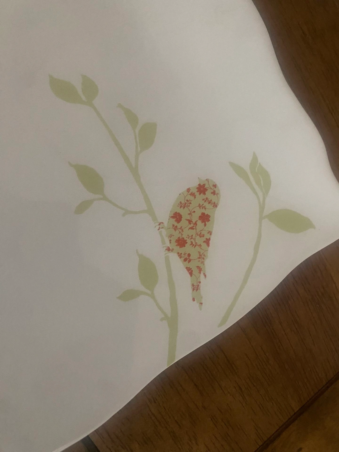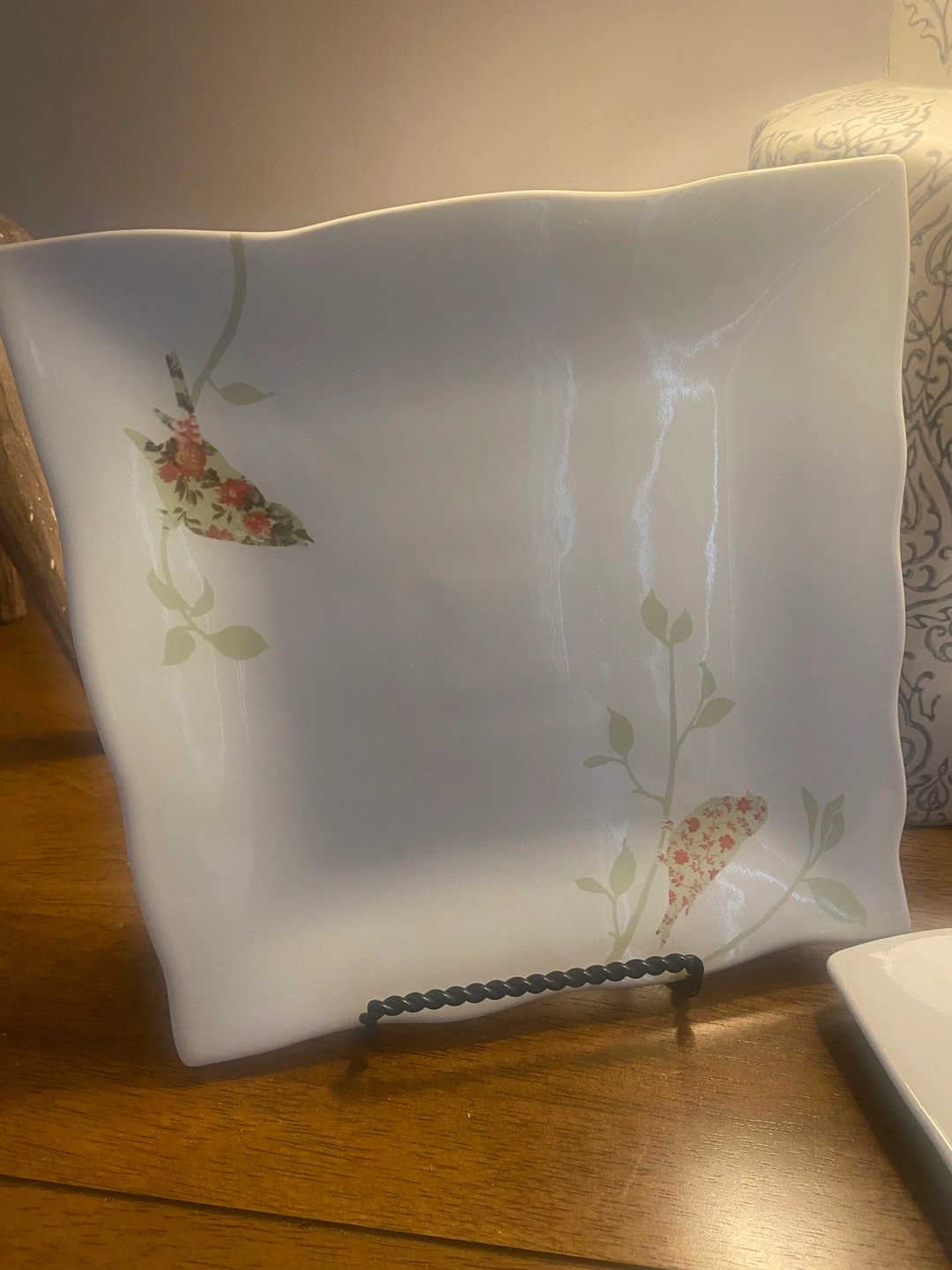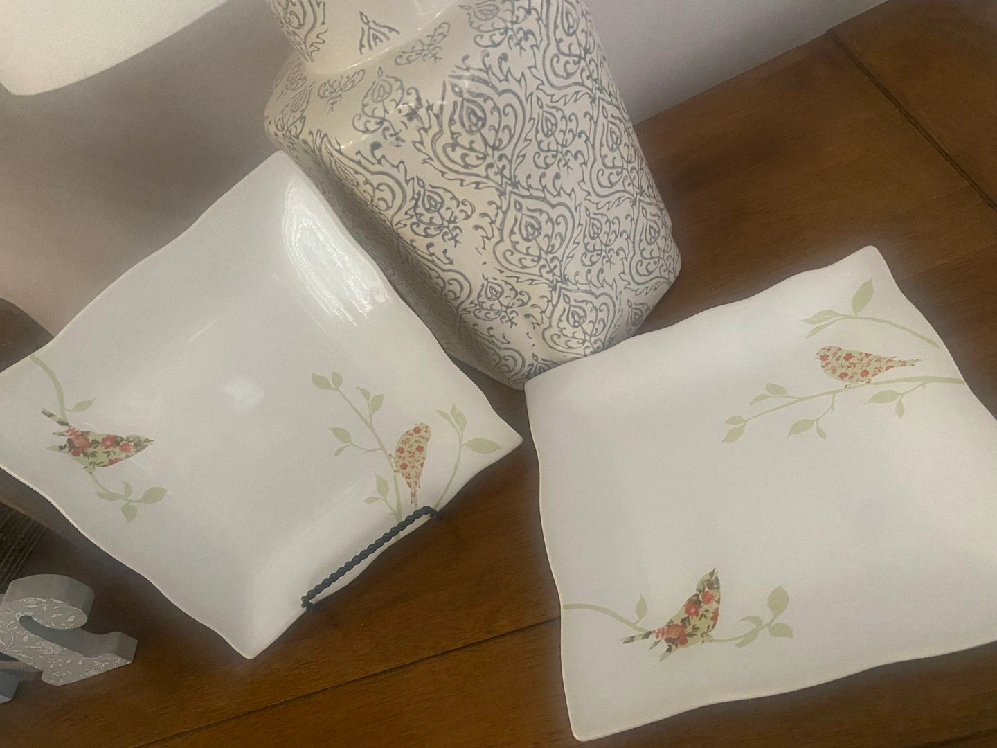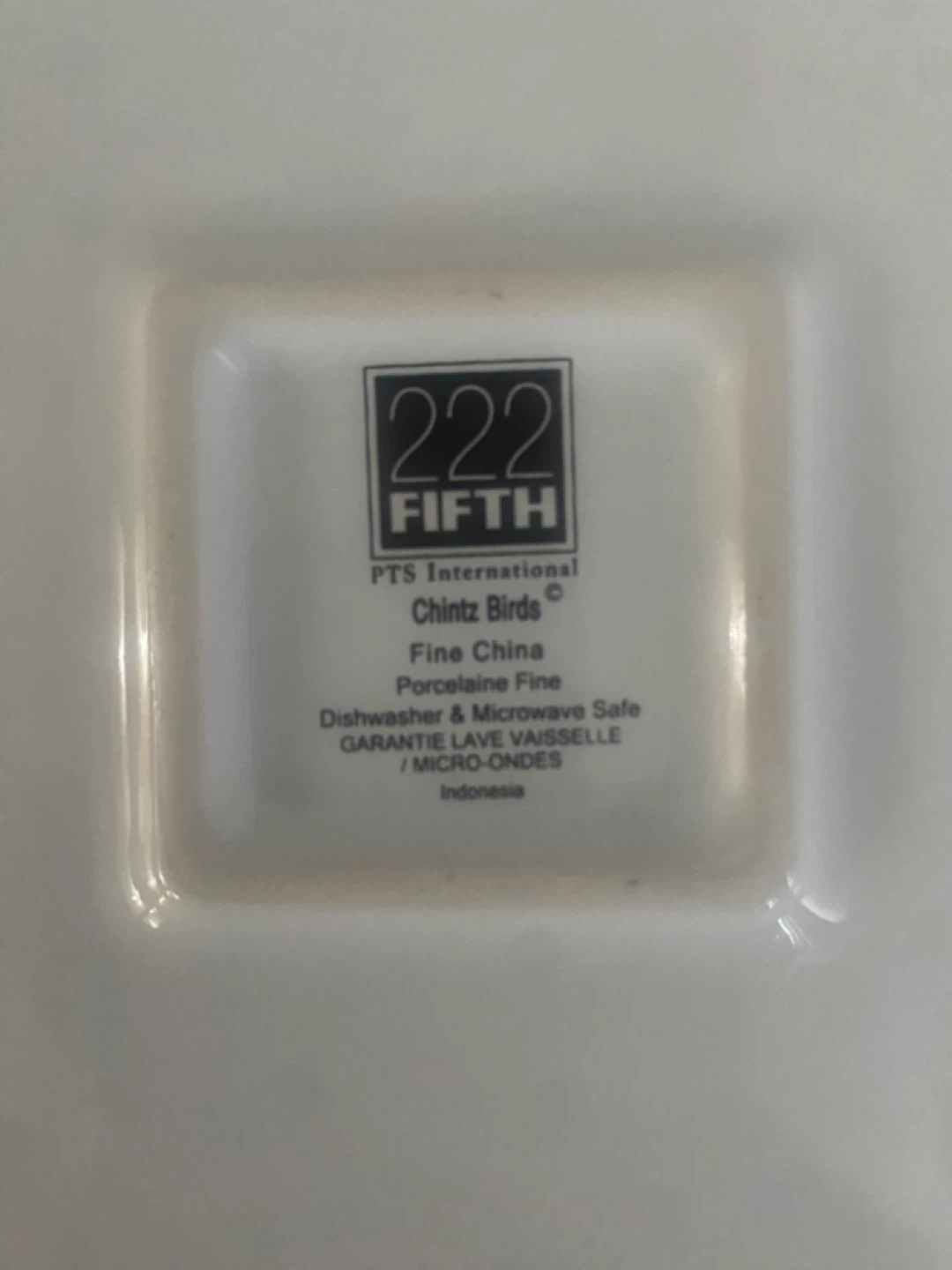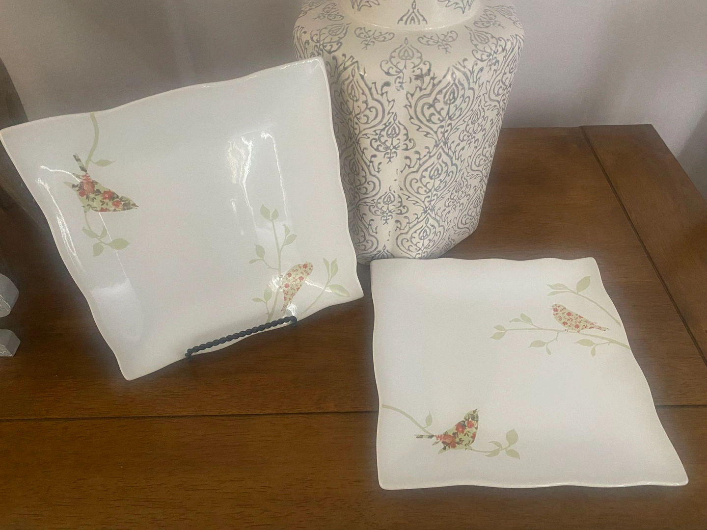 Set of 2, 222 Fifth Chintz Birds Square Dinner Plates. White porcelain with wavy edge and bird-themed chintz pattern. Dishwasher and microwave safe. Discontinued piece. Pickup in Orland Park or Countryside.