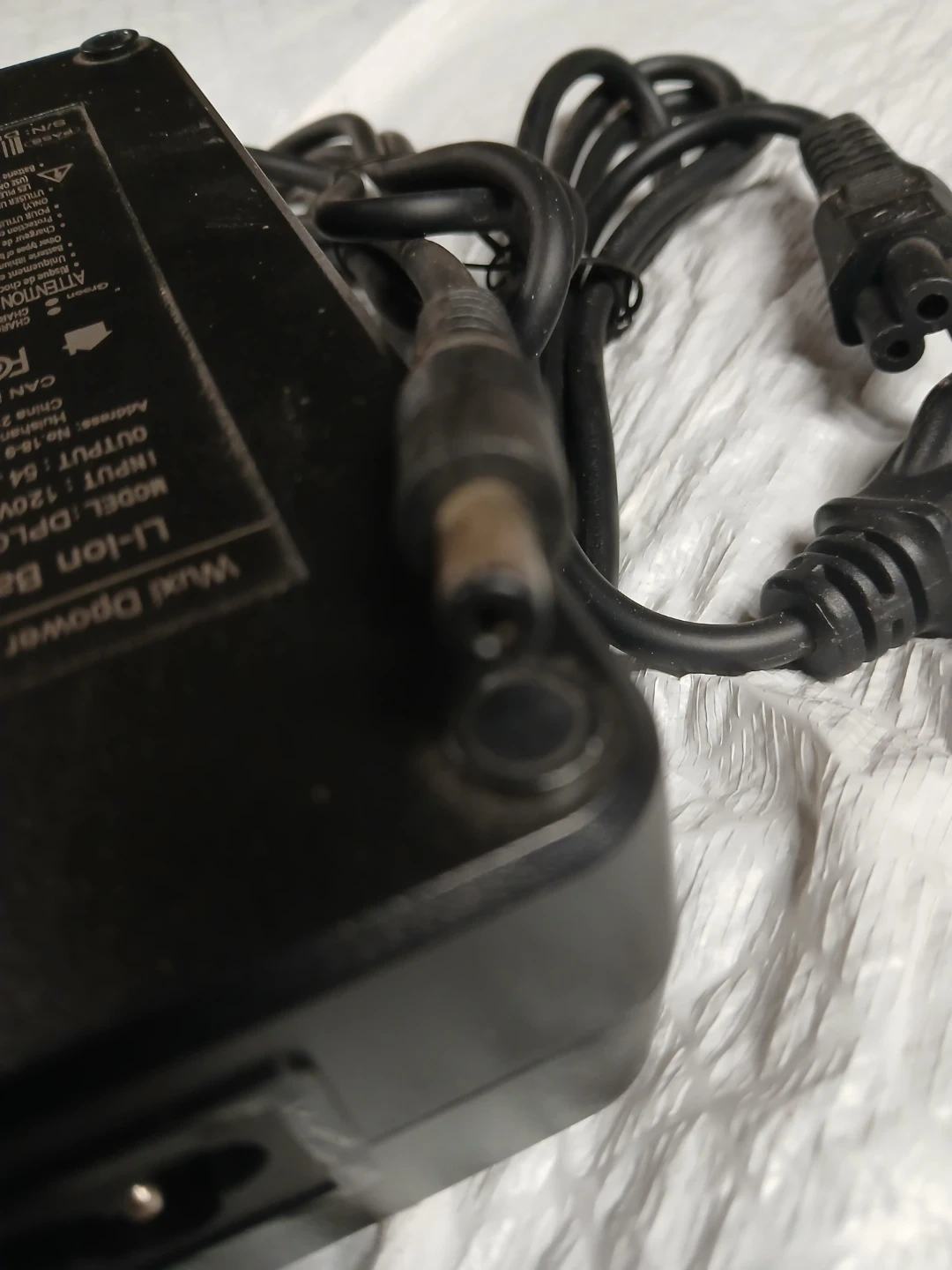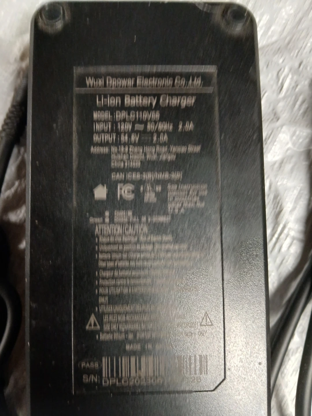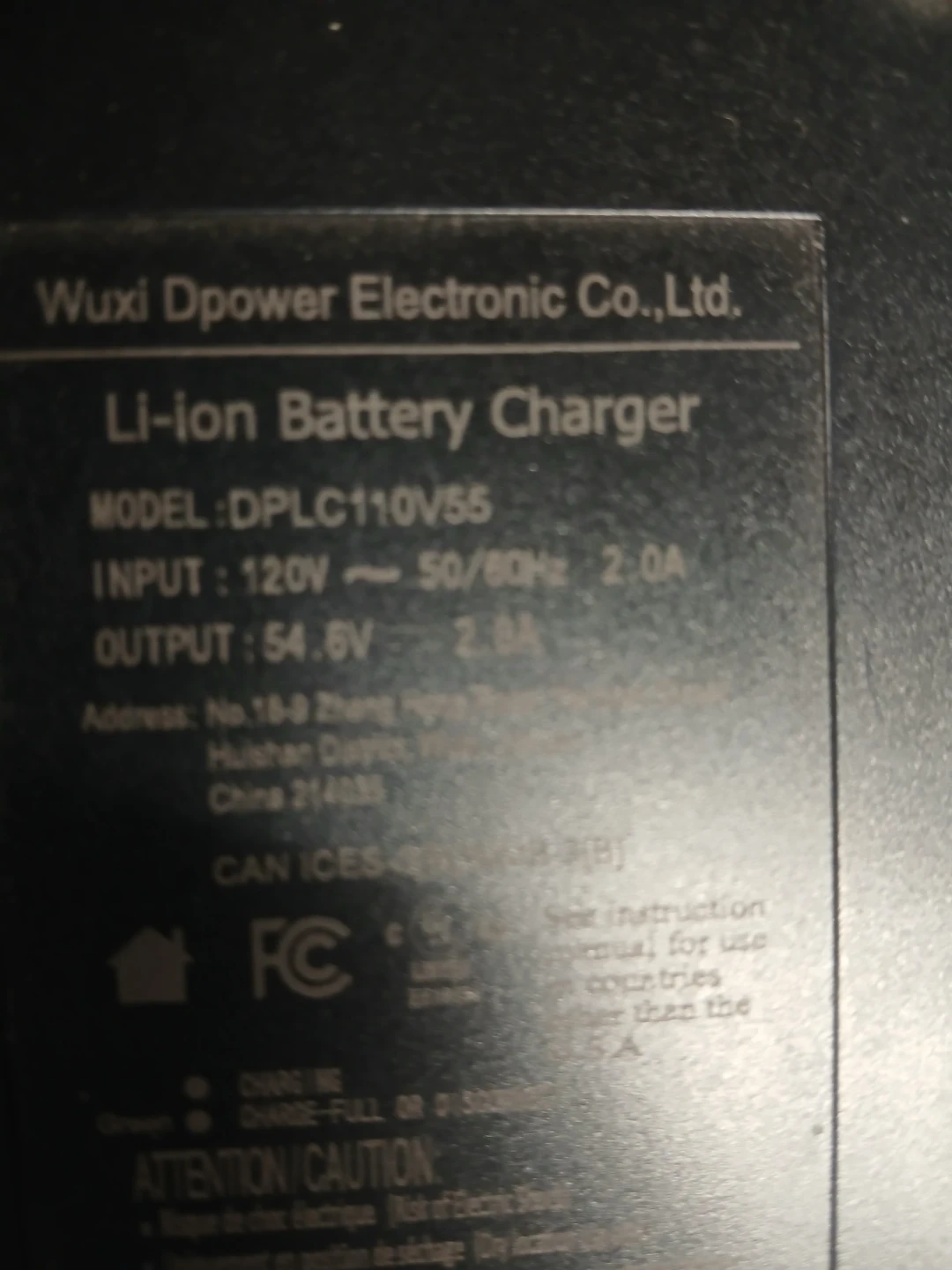 This is a Wuxi Dpower Li-ion Battery Charger. The model is DPLC110V55. It has an input of 120V ~ 50/60Hz 2.0A and an output of 54.6V 2.0A. It includes the charger and power cord.