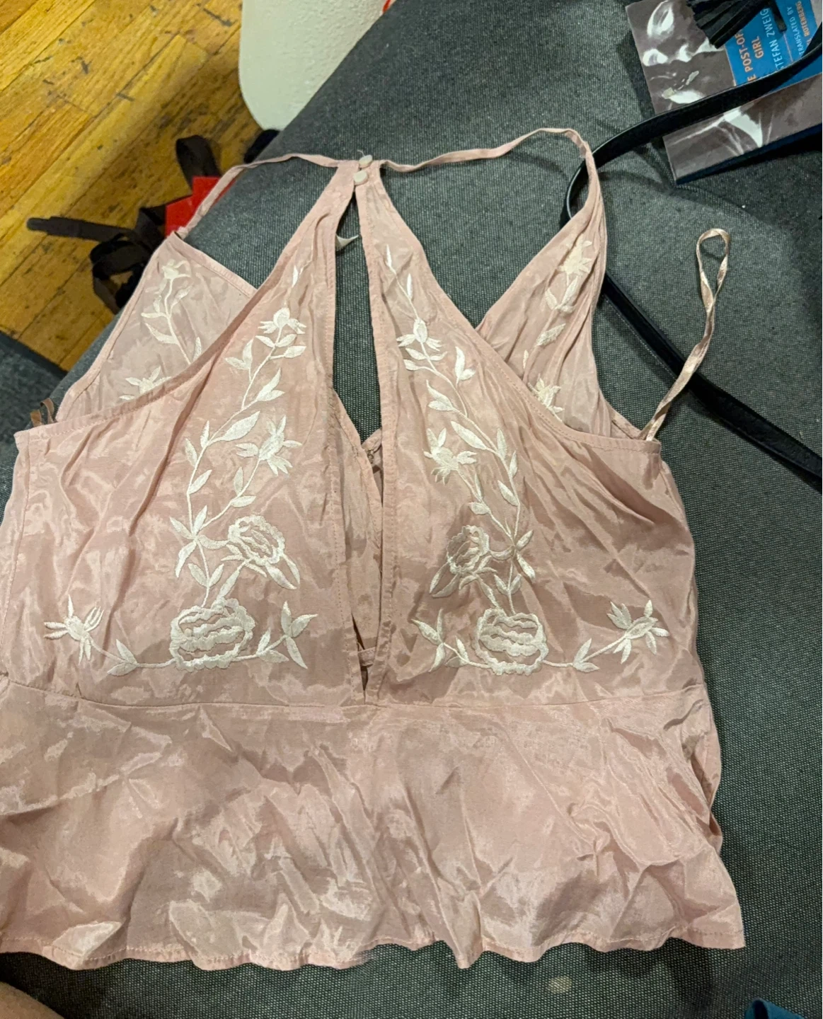 This pink halterneck tank top features beautiful white floral embroidery. It's made from a silky material and has a flattering V-neckline. The back has two small buttons at the neck.