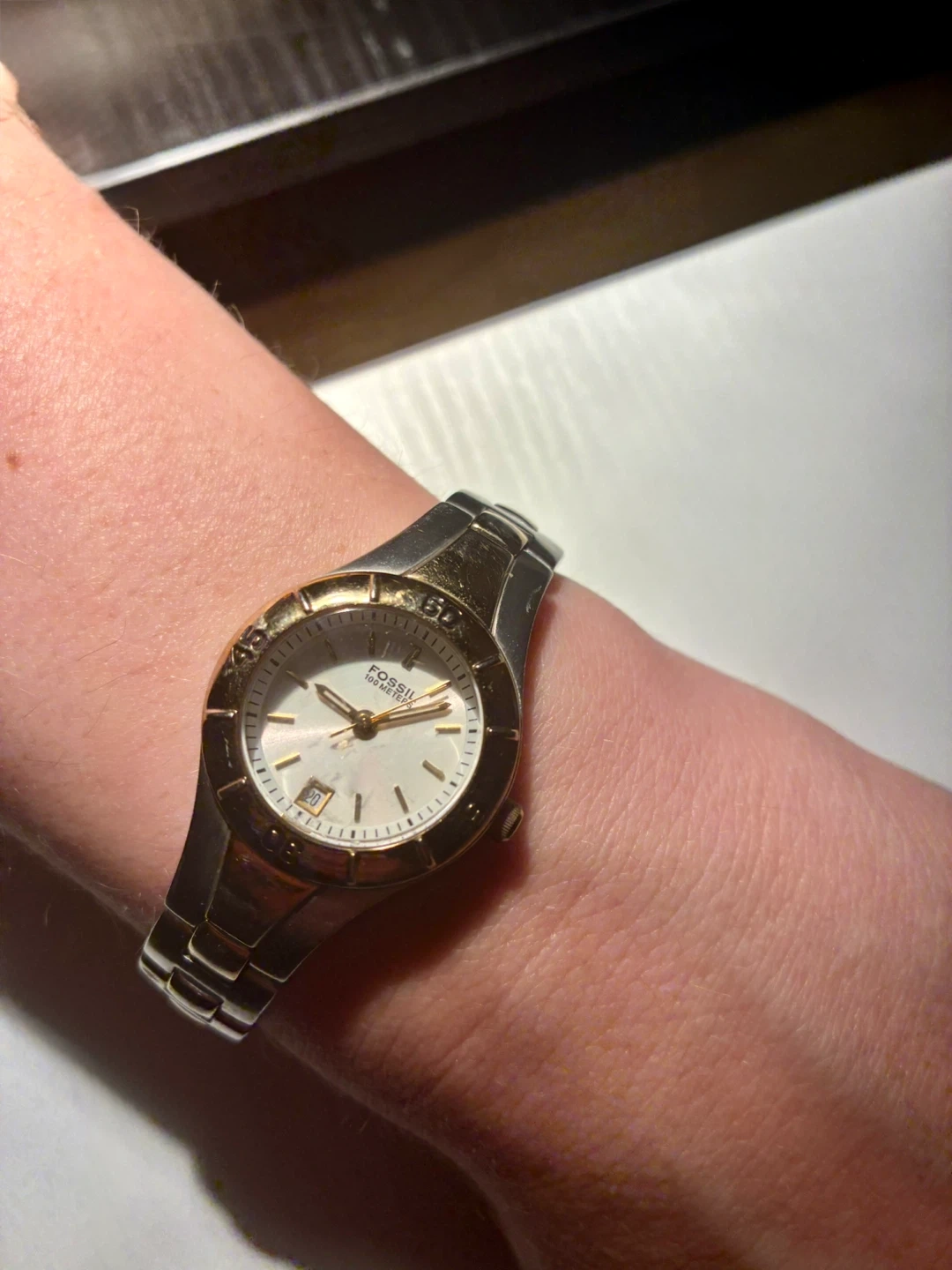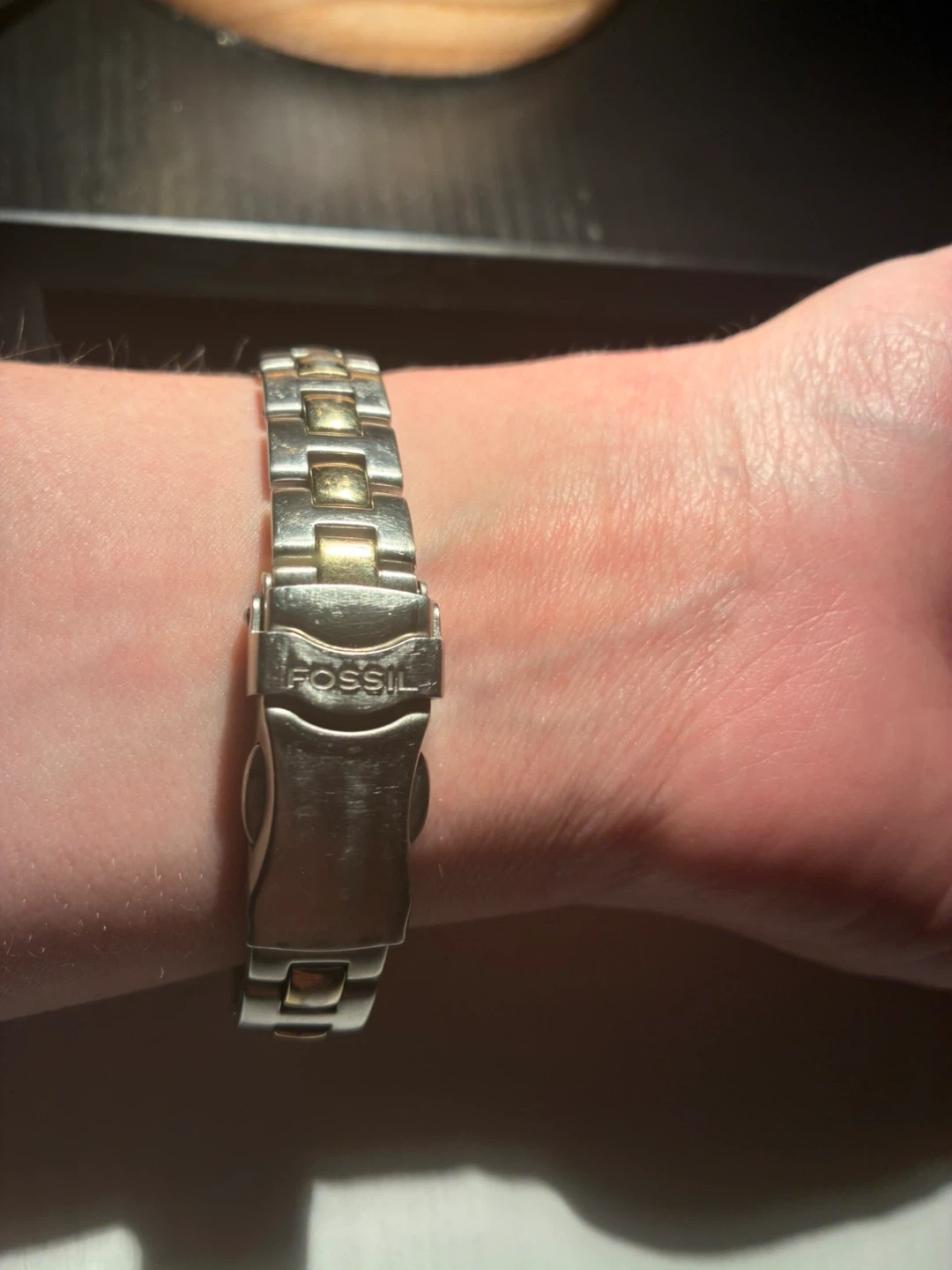 This is a Fossil two-tone watch with a gold-tone bezel and bracelet accents. It features a white dial with gold-tone hour markers and hands. The watch has a date display window at the 3 o'clock position. This classic timepiece is perfect for everyday wear or dressing up.