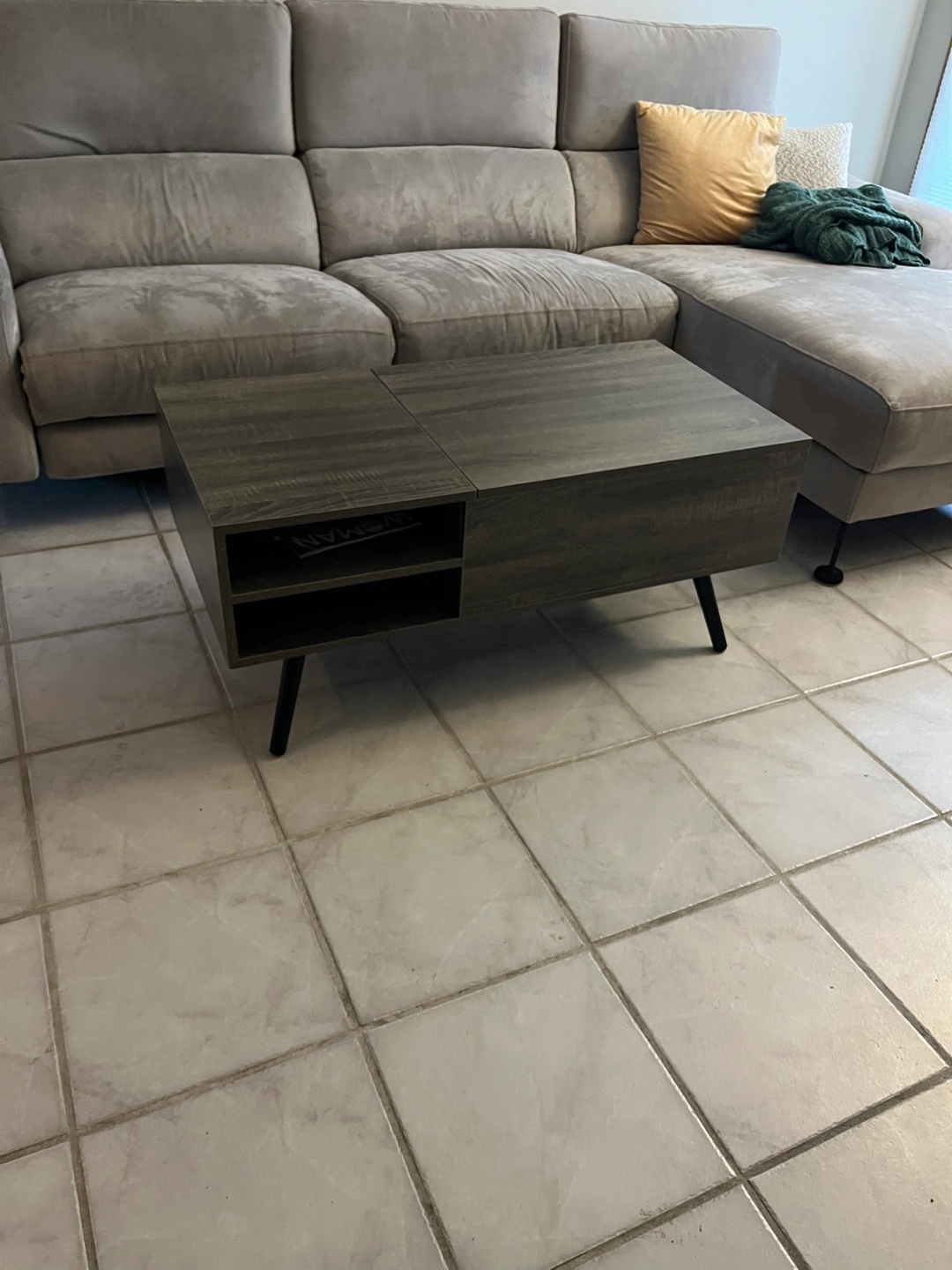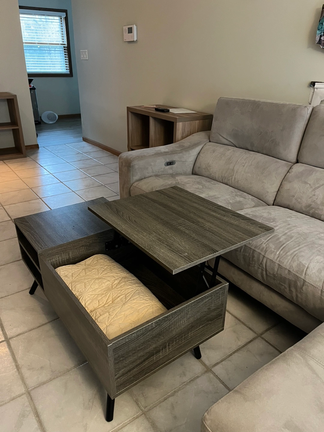 Lift top coffee table with storage shelves. Black legs. Gray wood finish. Good condition. Pick-up only.