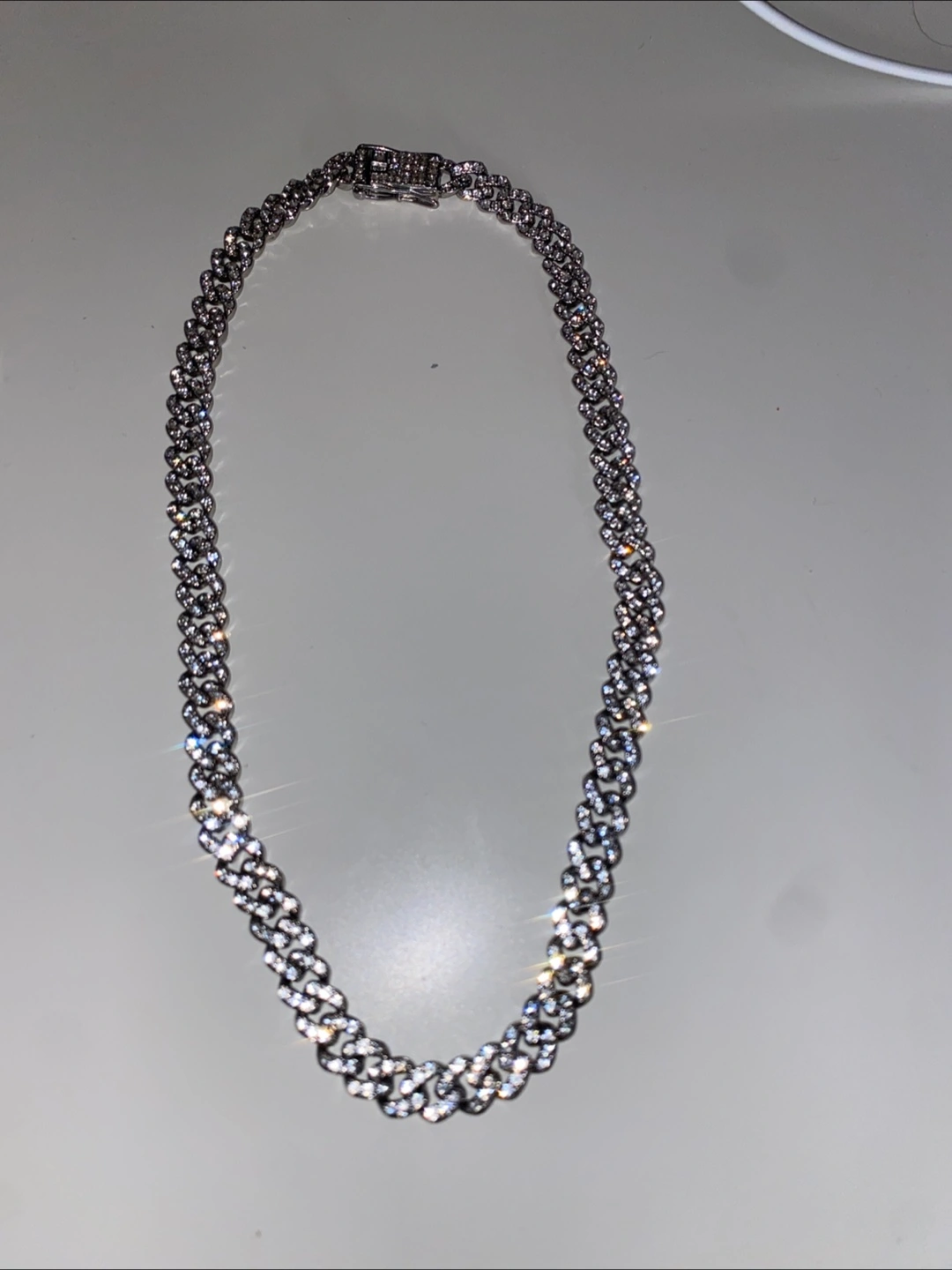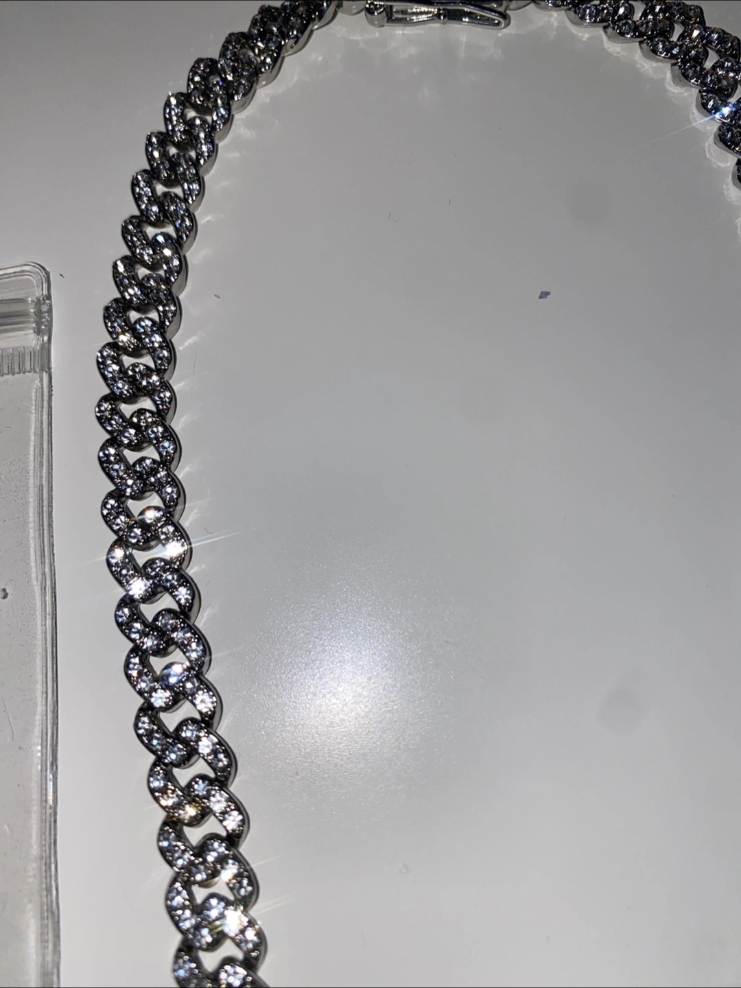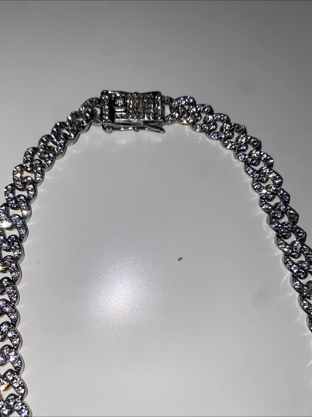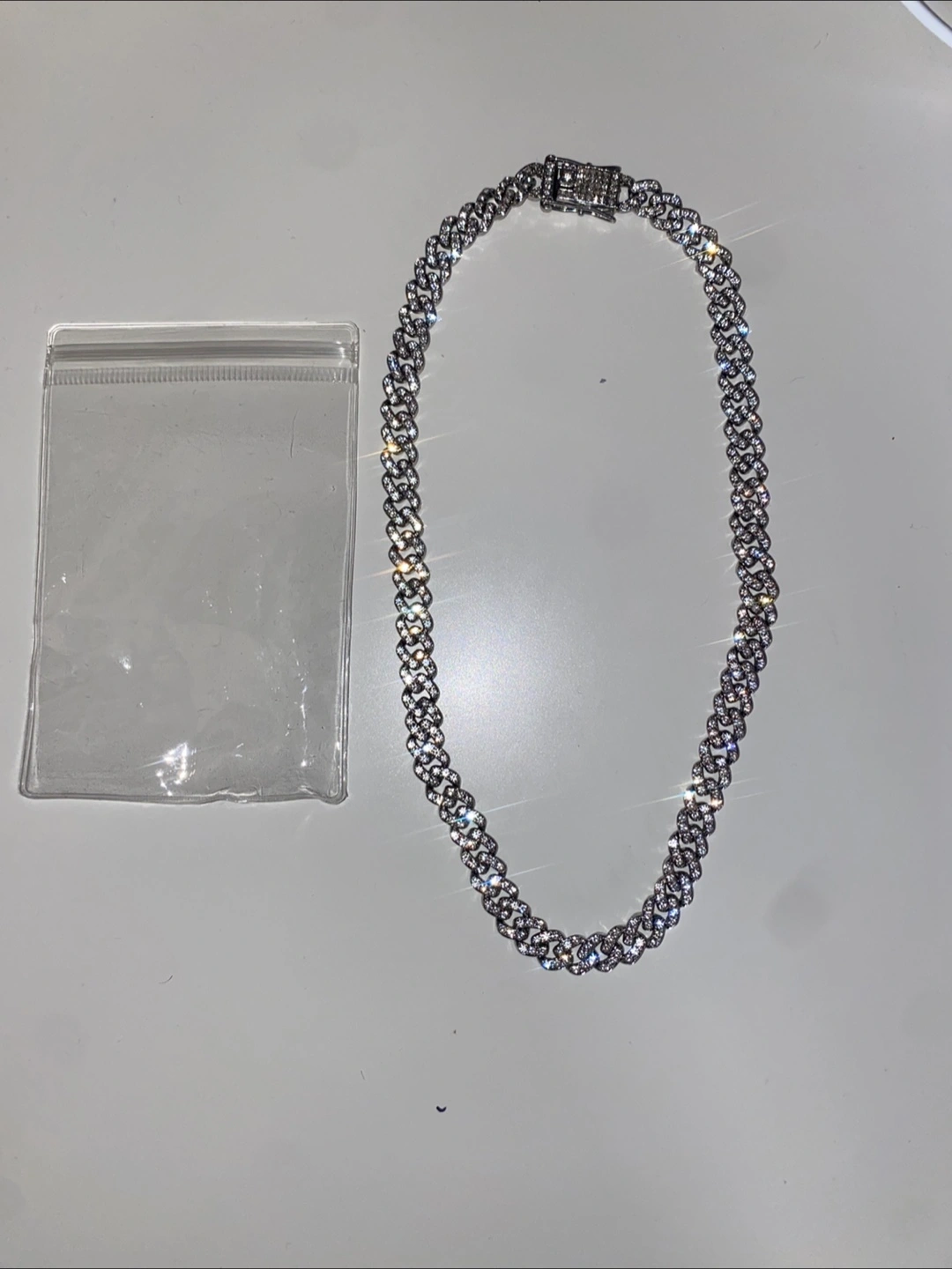 Selling a silver Cuban link chain. It's in brand new condition. 18 inch sterling silver w a zirconic gemstone. Shines like a diamond gem stone.