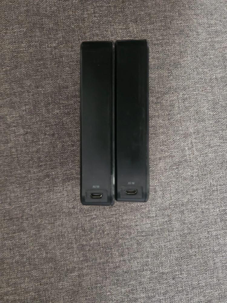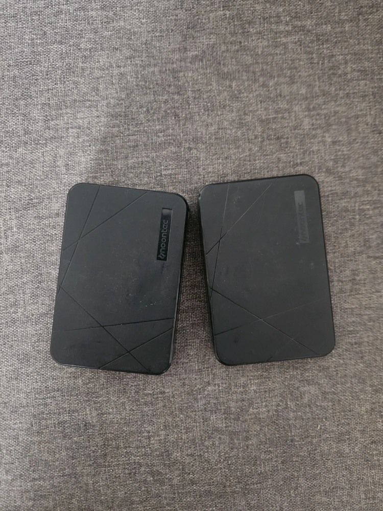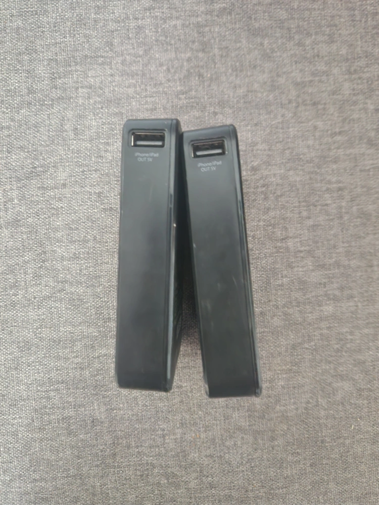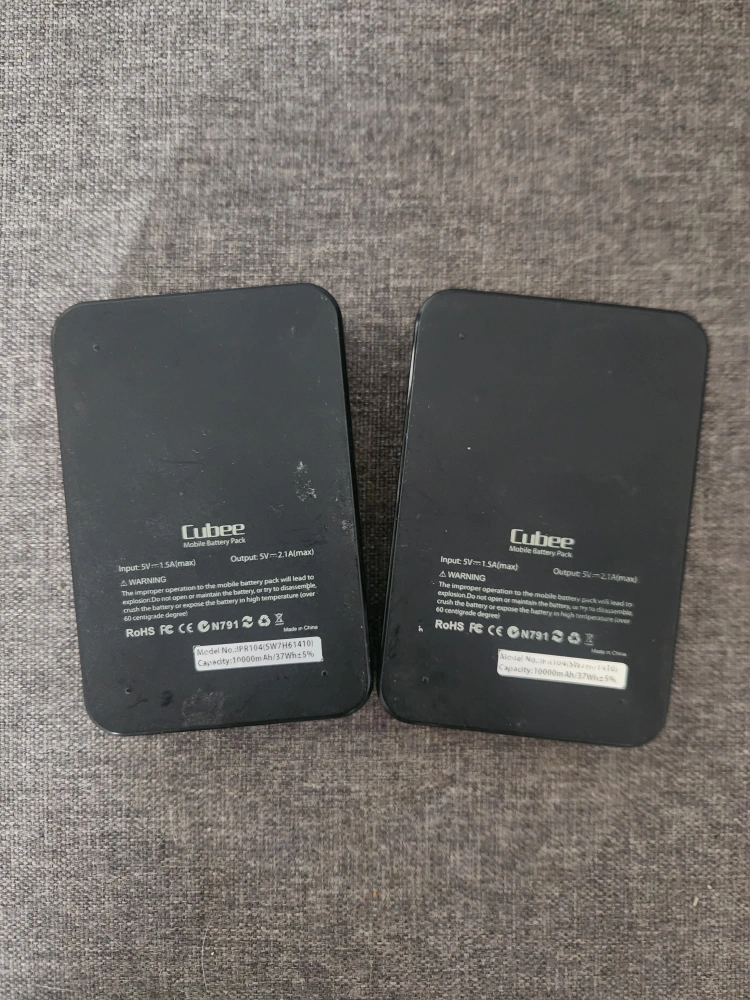 Two Cubee mobile battery packs. Black, rectangular shape. USB input and output. 5V-2.1A output.