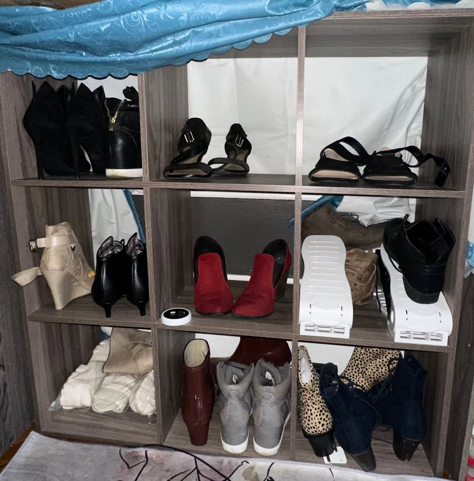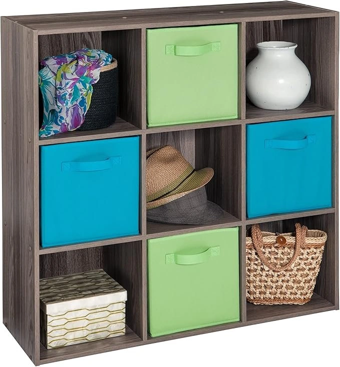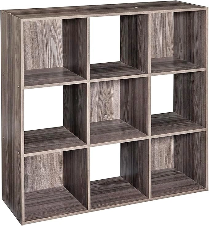 Cubeicals Organizer, 9-Cube, Natural Gray. Room Type: Closet, Living Room, Office Number of Shelves:9 Product Dimensions: 11.63"D x 35.86"W x 38.86"H Style: Shelf Units Finish Type: Unfinished Brand: ClosetMaid CUBE ORGANIZER: 9-Cube design with nine square, cube shelf openings CUBE STORAGE UNIT: Create storage and display space for any living area in your home for books, garments, décor, picture frames or keepsakes; Ideal for trendy organization with 5 back panels Cube compartments measure: 11.25 in. H x 11.25 in. W x 11.75 in. D Assembled: 35.86” W x 11.63” D x 35.86” H