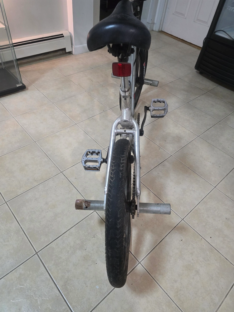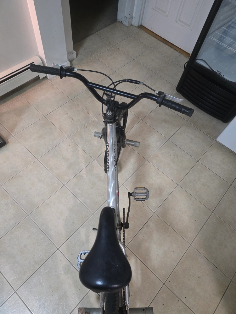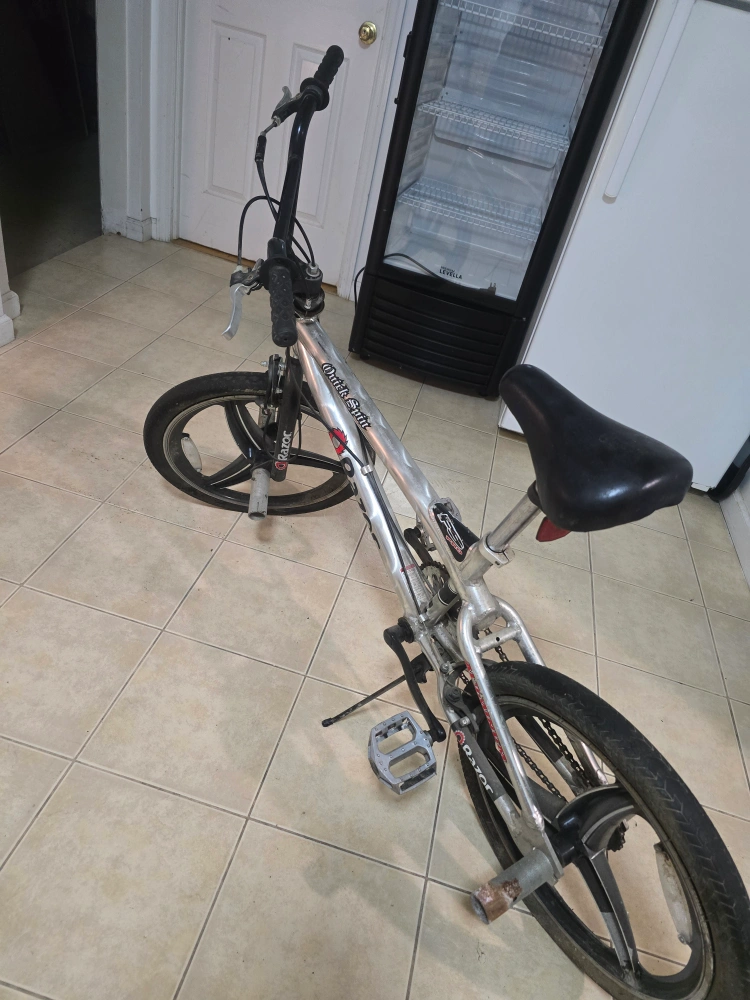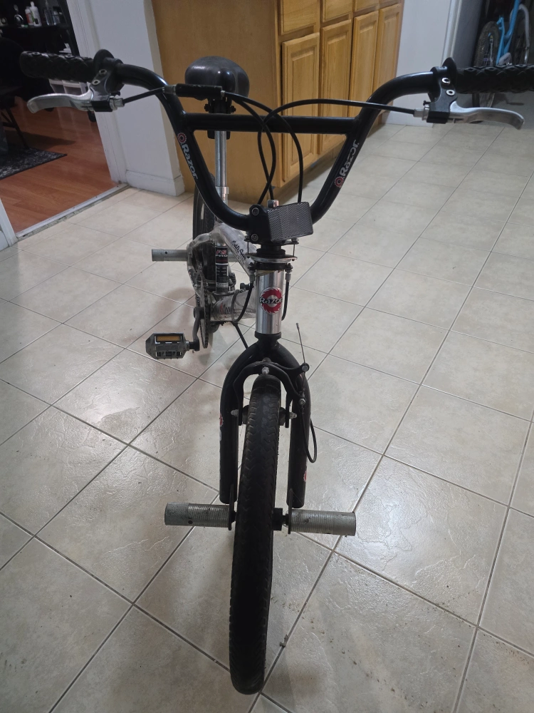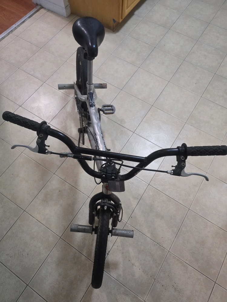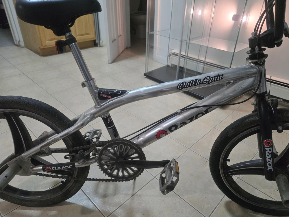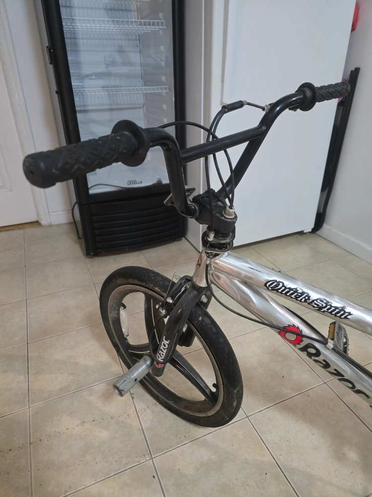 Selling a Razor Quick Spin BMX bike in silver. It shows signs of wear and use but is still functional. Great for anyone looking for a budget-friendly BMX. Less than 2 years old. Tires need some air and pegs are abit used but the brakes are in good condition. Great between 370m to 376m. 12ft. 4in. Good for teenagers and adults. Good control and handling. Moving everything must go!
