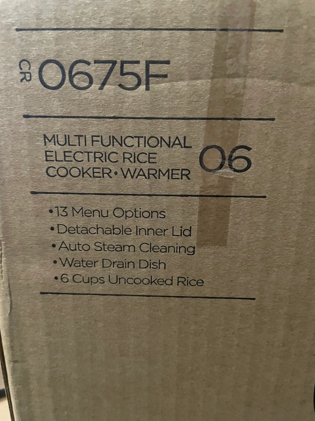 New in box, unopened. 13 menu options, detachable inner lid, auto steam cleaning, water drain dish, 6 cups uncooked rice.
