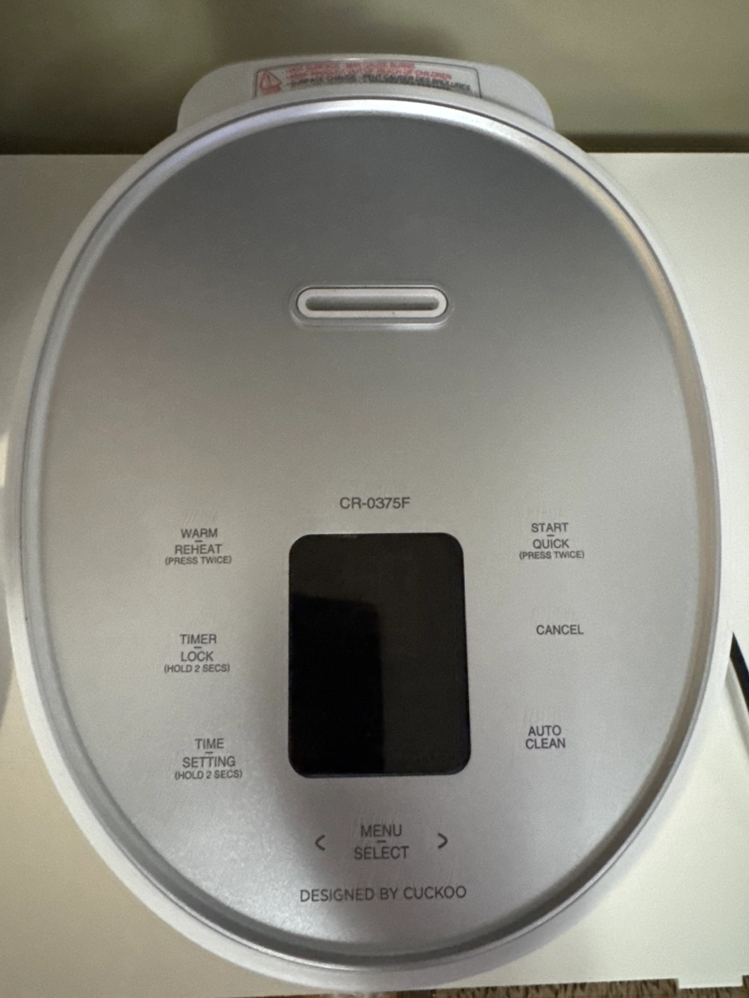 CUCKOO CR-0375FW 3 Cup (Uncooked) / 6 Cup (Cooked) Micom Rice Cooker & Warmer with Nonstick Inner Pot, 10 Menu Modes, LCD Display, Fuzzy Logic Tech, Auto Clean (White) Pick up only! Kew Gardens & Richmond Hill area. White rice cooker with digital display, multiple cooking functions, and an inner pot. Has a removable steam tray. *It’s not a pressure rice cooker. It takes more than an hour to cook brown rice. Amazon link: https://a.co/d/iFgLXBY