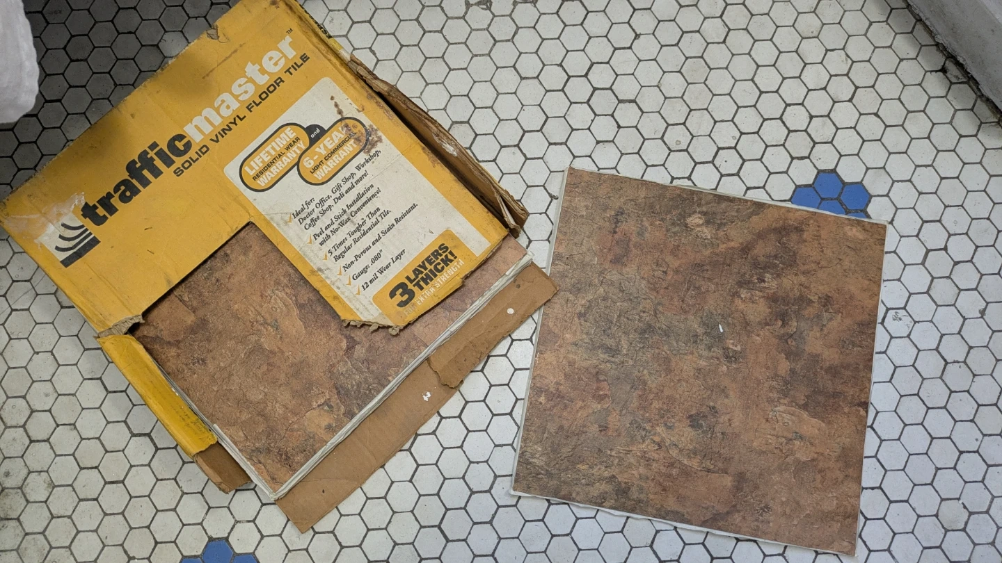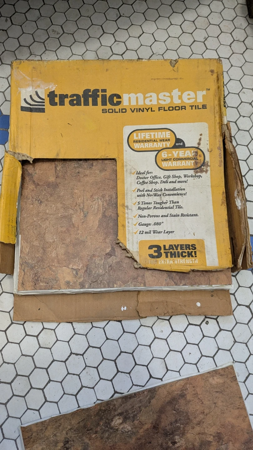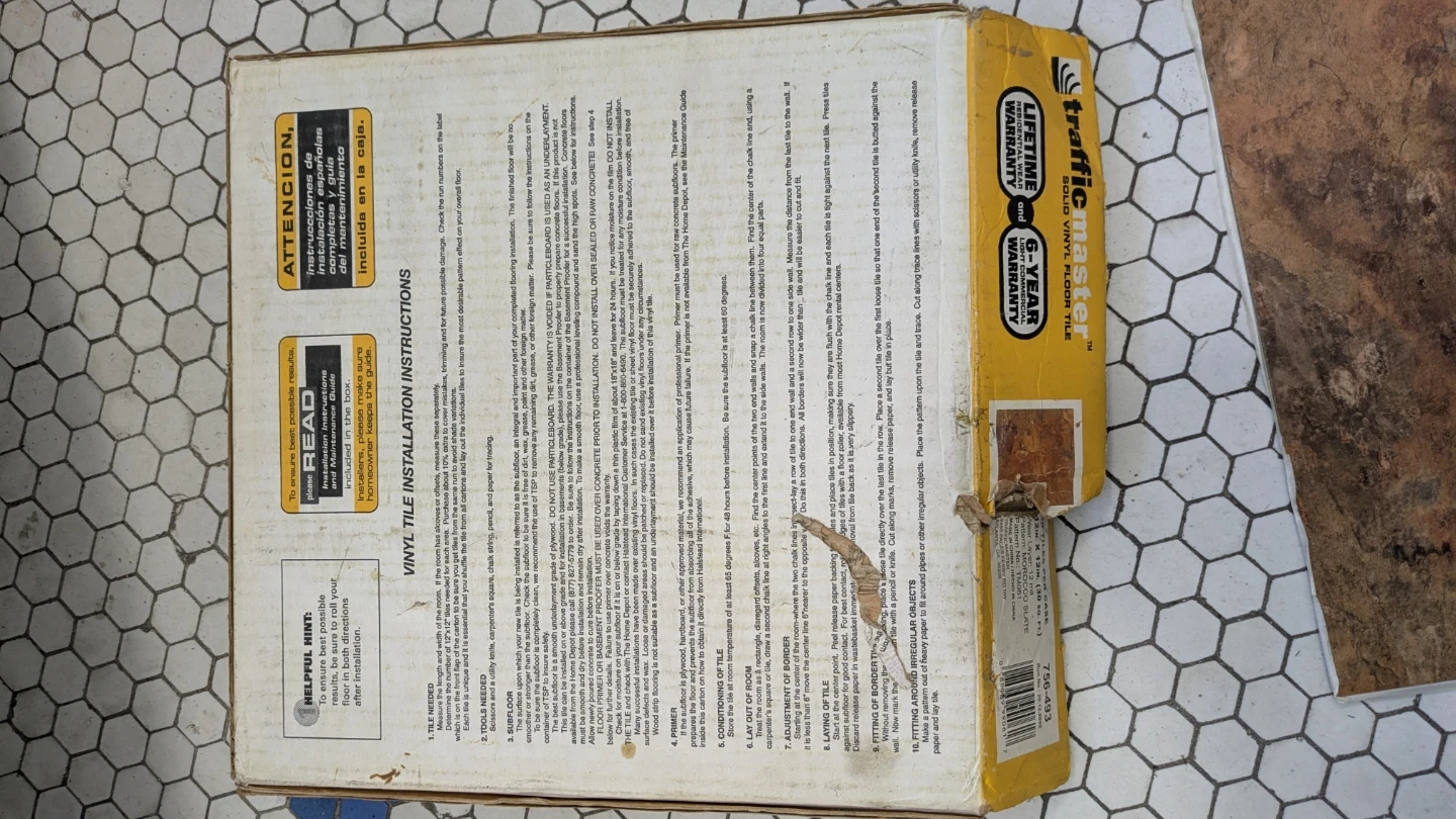 This box contains TrafficMaster solid vinyl floor tiles. They feature a peel and stick installation, making them easy to apply. The tiles have a 12 mil wear layer for durability. They're also water-resistant and stain-resistant.