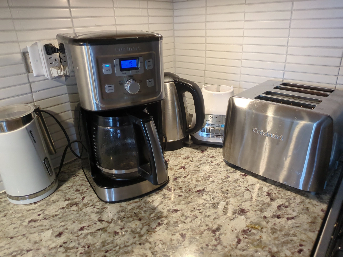 Stainless steel coffee maker. Programmable with digital controls. Includes glass carafe. Used condition.