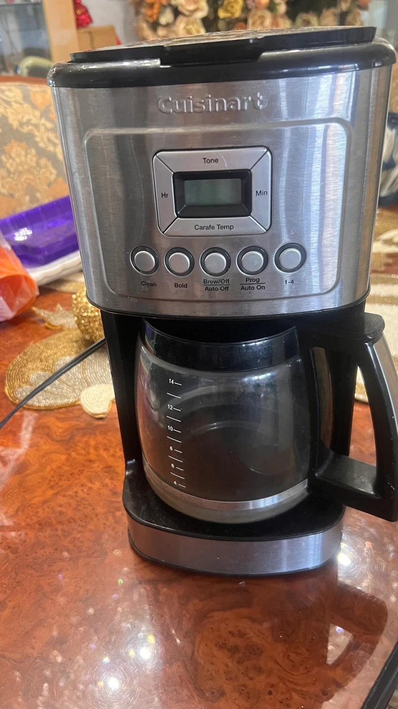 Cuisinart coffee maker with carafe temp control Features include clean, bold, brew/off auto off, prog auto on, and 1-4 cup settings